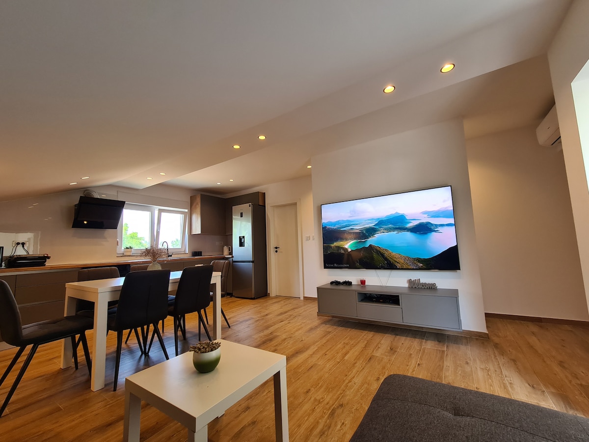 ** Pis de pedra nou a prop del mar amb fantàstiques vistes al mar **. Pis de 55 m2 per a 2 + 1 hoste. Amplia sala d'estar amb sofà que es converteix en un llit doble (televisor intel·ligent, aire condicionat)Cuina (forn, rentaplats, cafetera). 1. Dormitori (llit doble gran, armari ample) amb vàter (dutxa). L'apartament té una terrassa privada (10m2) amb increïbles vistes al mar. La terrassa conté una taula per a 4 persones.