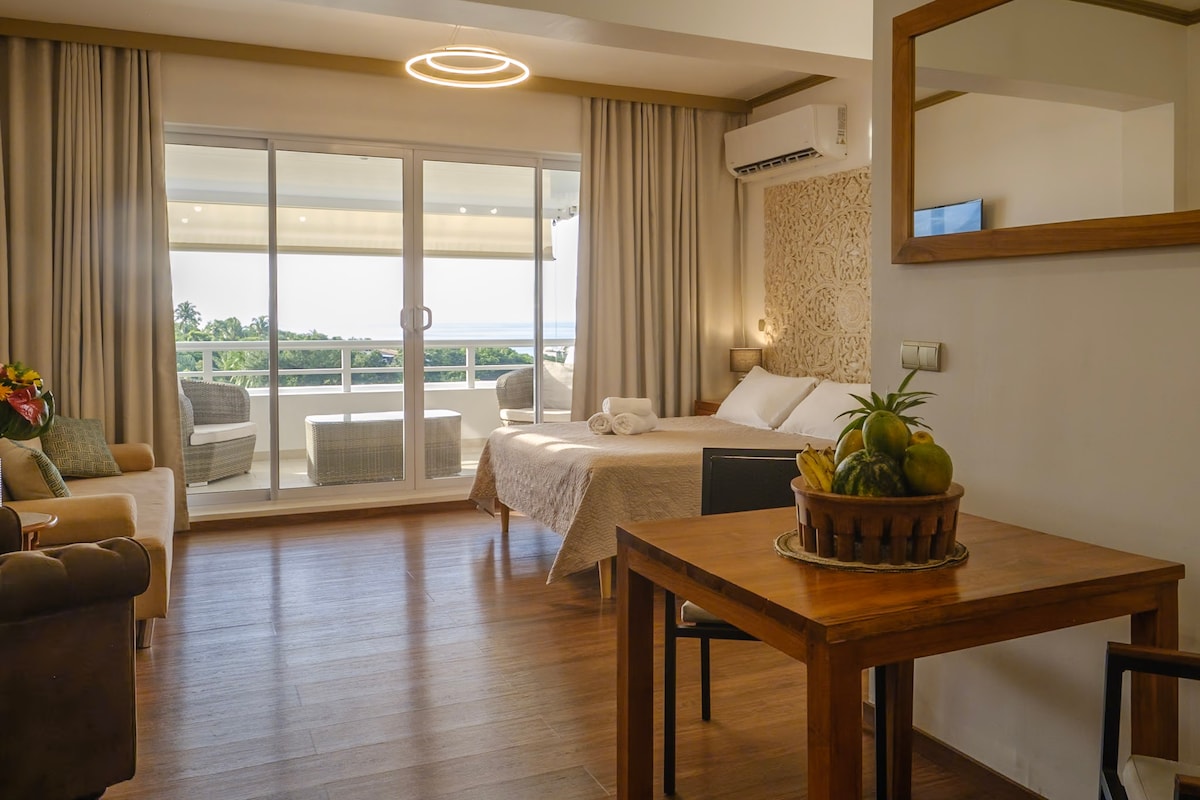 Al paradís, a la vora de la llacuna, hi ha un estudi de 71,5 m2 que inclou 21,5 m2 de terrassa, que inclou una cuina americana totalment renovada i una sala d'estar amb sofà. A l'interior, un bany amb dutxa a peu, una pica doble, així com un vestidor i un entresol amb un llit de 160 x 200 ( possibilitat d'afegir dos matalassos de 90x190 per a nens). Tot amb vistes a un jardí privat amb flors (dutxa a l'aire lliure) i al final de la llacuna turquesa...