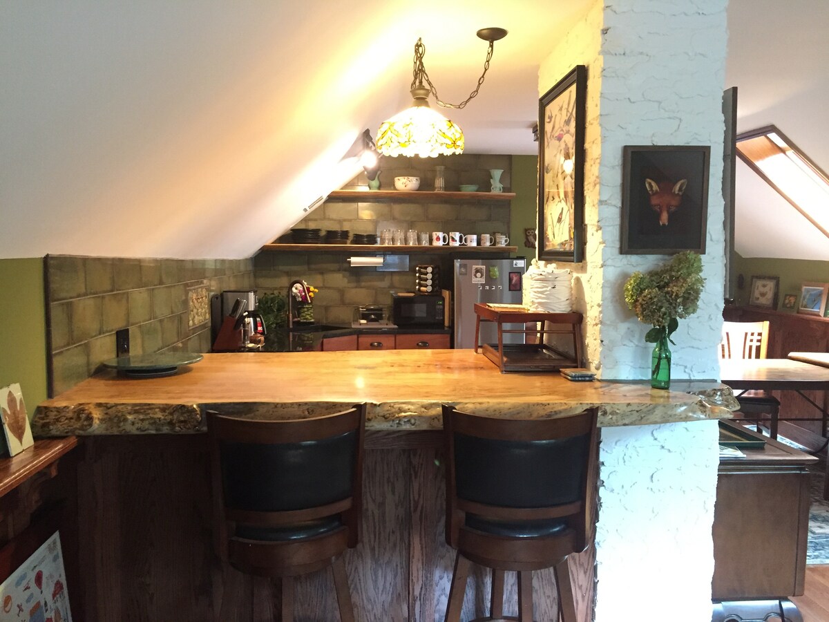 Gaudeix de la tranquil·litat amb la comoditat del centre de la ciutat! Ambient lluminós i obert. Productes d'art i música, llibres, joguines, jocs, CD, pel·lícules. Dues terrasses i un pati cobert. He trobat jardins i galeries d'art. Cuina totalment equipada amb taulells de granit. Grans finestrals al dormitori de la planta baixa amb llit de matrimoni i llar de foc de gas. Accés a l'escala al llit «queen» en un skylit loft. Una escapada perfecta per a artistes/escriptors de retir, aventurers solitaris, parelles, viatgers de negocis i famílies petites amb nens que es comporten bé.