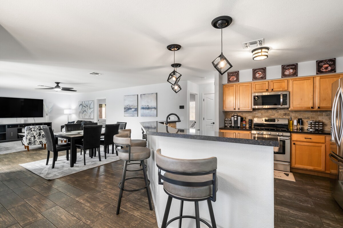 Luxury family home on popular golf course. Made for vacation and entertaining. A beautiful oasis backyard complete with HEATED pool, waterfall, BBQ & fire pit create a perfect outdoor ambiance. If you're looking to relax, take a soak in the hot tub or if you want to relax inside, sit in the oversize tub in the spa bathroom. Family friendly: complete with bunk beds, crib, an outdoor play set, books and toys. We appreciate military service professionals and offer a discount.