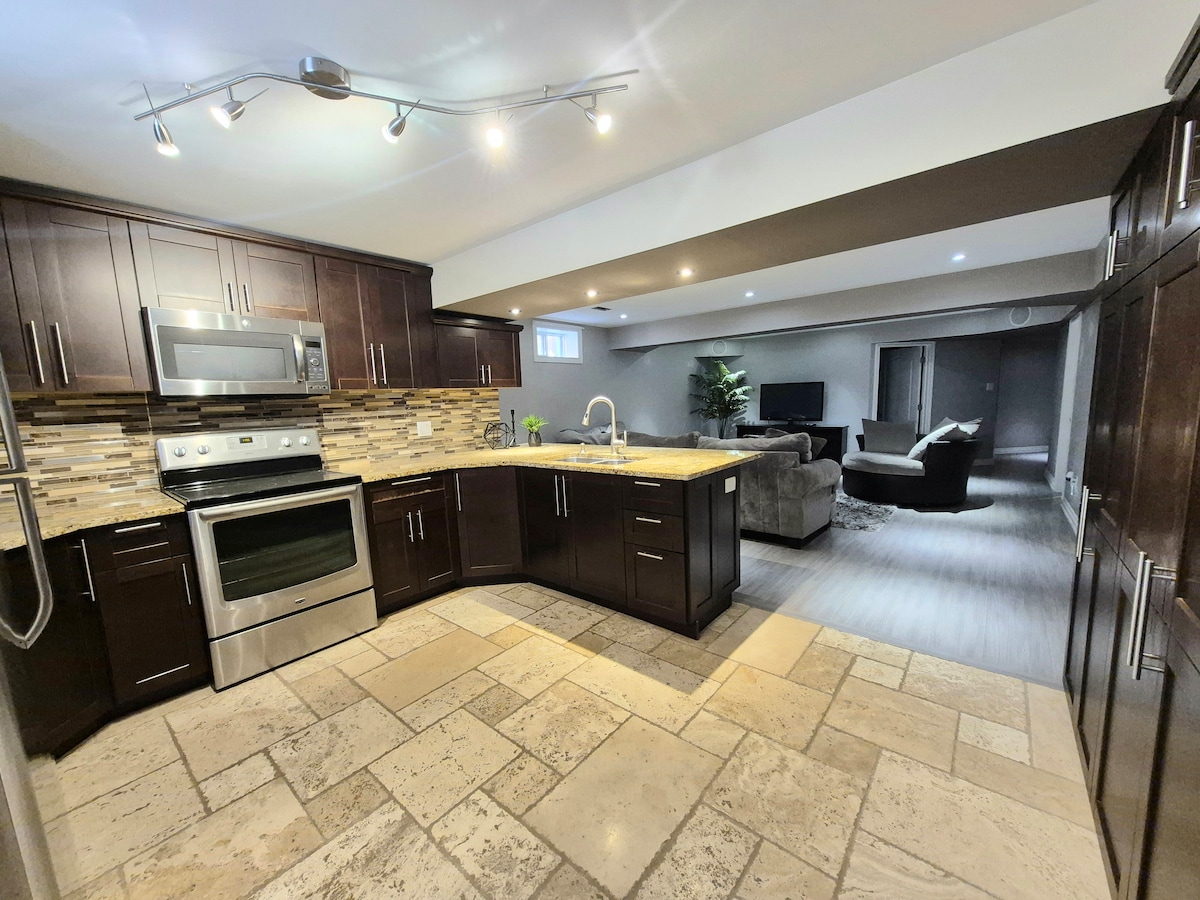 Pis privat al soterrani de nova construcció a Oshawa amb 1 dormitori, zona de treball/estudi i safareig privat. Relaxa't a la banyera d'hidromassatge després d'explorar els senders, parcs i granges de la zona. A prop de l'Ontario Tech University, Durham College, botigues i restaurants. Accés fàcil a Durham Transit, GO Bus/Train i Highway 407. Ideal per a parelles, professionals o famílies petites.