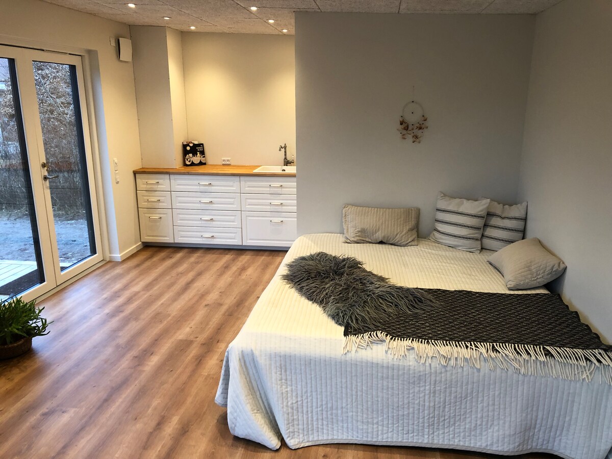 Annex amb bany privat i entrada independent. Cuina petita amb torradora i bullidor d'ous, però no hi ha opció per cuinar aliments calents. Cafè i te a disposició. Wi-Fi NO HI HA TELEVISIÓ Esmorzar lleuger a la nevera (1 bol, 1 pa de sègol, formatge, melmelada, suc) Netto a 500m Situat a "Vestbyen", on hi ha molts blocs de pisos i cases de ciutat, no hi ha moltes zones verdes, però a canvi només hi ha 5 minuts a peu de la presó. Tingueu en compte que estem molt a prop de Vestergade 🚗 Sortida abans de les 11:00