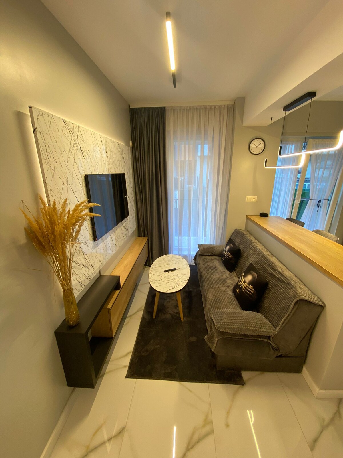 Hola! Em dic Daniela i t'ofereixo un estudi totalment moblat i elegant. La zona de descans i de dia estan delimitades, com es pot veure a les fotos. Hi ha un llit doble i un sofà llit. L'estudi també està equipat amb TV de pantalla plana i cuina totalment equipada, que ofereix als hostes fogons, microones, nevera i rentadora al bany. Es troba a només 1 km de l'aeroport d'Otopeni. Espero que estiguis molt bé! 😀