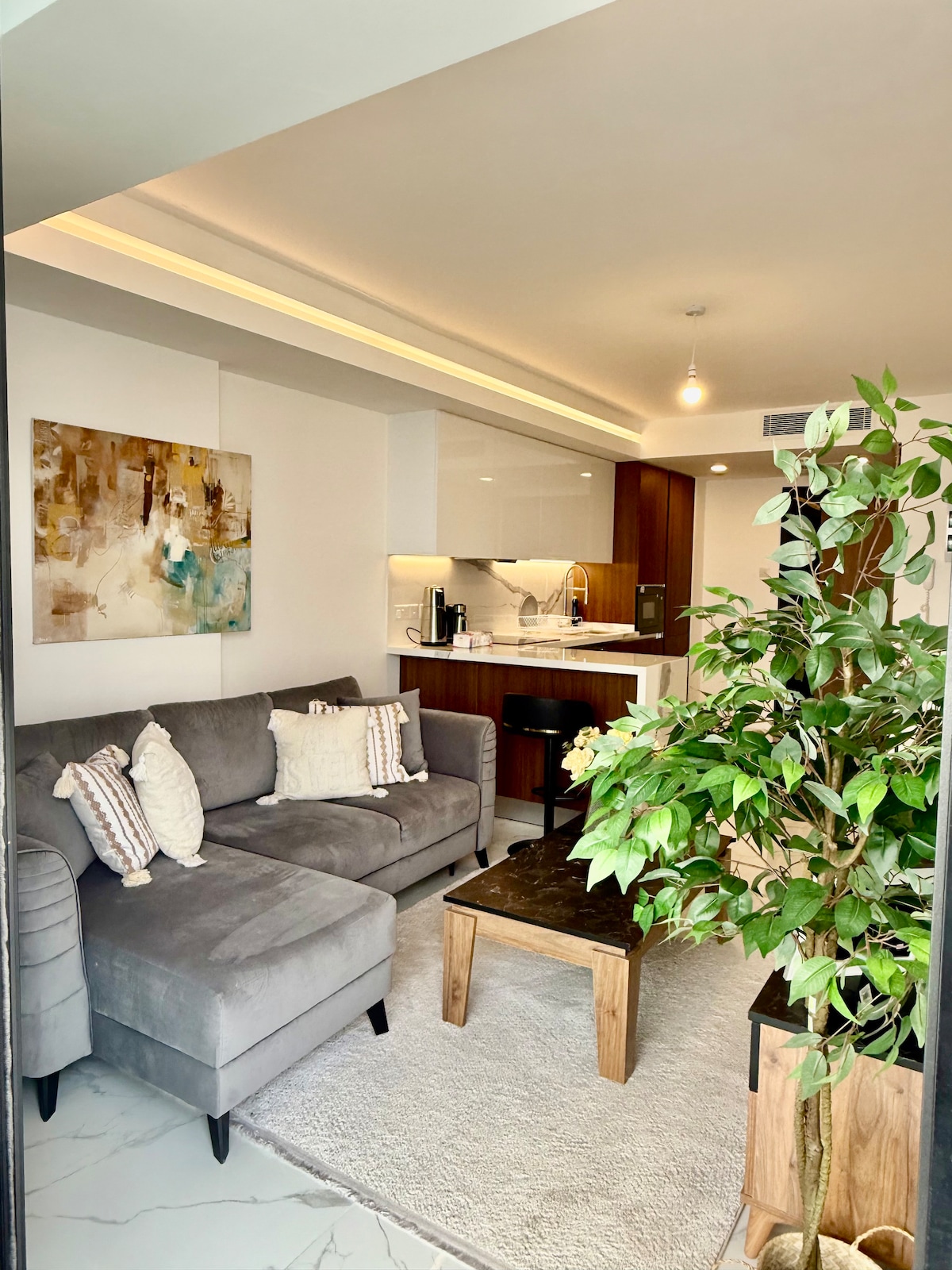 🌊 Boho-style apartment just 200 m from the sea & restaurants. Equipped kitchen, Netflix, A/C, and balcony. Free access to pool, sauna, hammam, gym, tennis court, playground & more. Supermarket is only 100 m away, open daily from 7:30 AM–10:30 PM. Perfect location for both relaxation & adventure—with nearby casinos and wild donkeys by the sea that walk beside your car. A truly unique stay awaits!