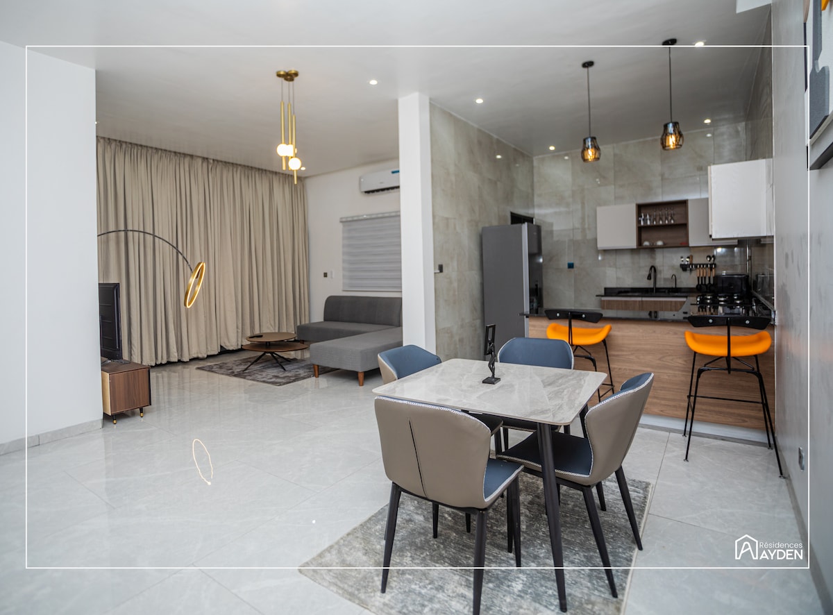 Appartement meublé entièrement climatisé avec 1 chambre lumineuse; situé au 1er étage d' un immeuble R+ 2 avec - une salle de bain équipée de Chauffe eau - Cuisine équipée avec toute la vaisselle - Connexion internet illimitée avec fibre optique - Abonnement Canal + avec chaînes internationales - Un balcon à l étage avec terrasse fleurie - Un agent de sécurité - Ménage une fois pas semaine - 15 kwh d'éléctricité offert ; au dela , vous paierez un complément pour votre séjour;