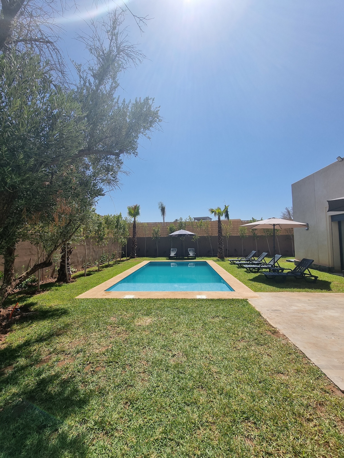 Casa arquitectònica situada al camp típic de la regió de Marrakech, per als amants de la natura. Bonic jardí, verdures de l'hort i galliner. Hi ha una piscina privada. Tot això en una parcella de 5000m2. A la propietat hi ha un cuidador i un netejador de piscines neteja la piscina dues vegades a la setmana a l'hivern i tots els dies a l'estiu. L'aigua i l'electricitat són recursos sagrats al país : a) El respecte al medi ambient és important.