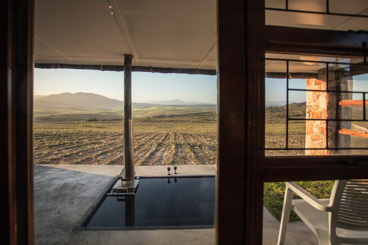Off-grid eco cottage situated on a working regenerative farm in the heart of the Overberg, with panoramic views towards Walker Bay and the Kleinriviersberg mountains. Surrounded by fynbos and vineyards, this cottage has pure spring fed water, a wood fired hot tub, solar power so is not affected by load shedding. Guests are welcome to wander around the farm, swim and fish in the dams, and meander through the veggie gardens We regret no babies, children or pets are allowed for safety reasons.