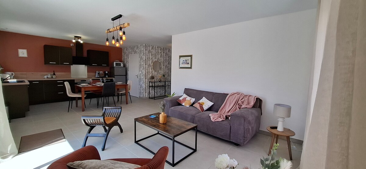 Casa recent de 71 m2, lluminosa, situada a mig camí entre la ciutat del mercat i la platja. La casa consta d'una gran sala d'estar (sala d'estar - cuina), un bany i 2 dormitoris (un amb entresol). Una gran terrassa als costats sud i oest et permet gaudir del sol. L'entorn és molt tranquil (camí de la granja), la casa està fora de la carretera i sense cap vista. Tens una vista de les cultures dels voltants i una petita vista al mar.