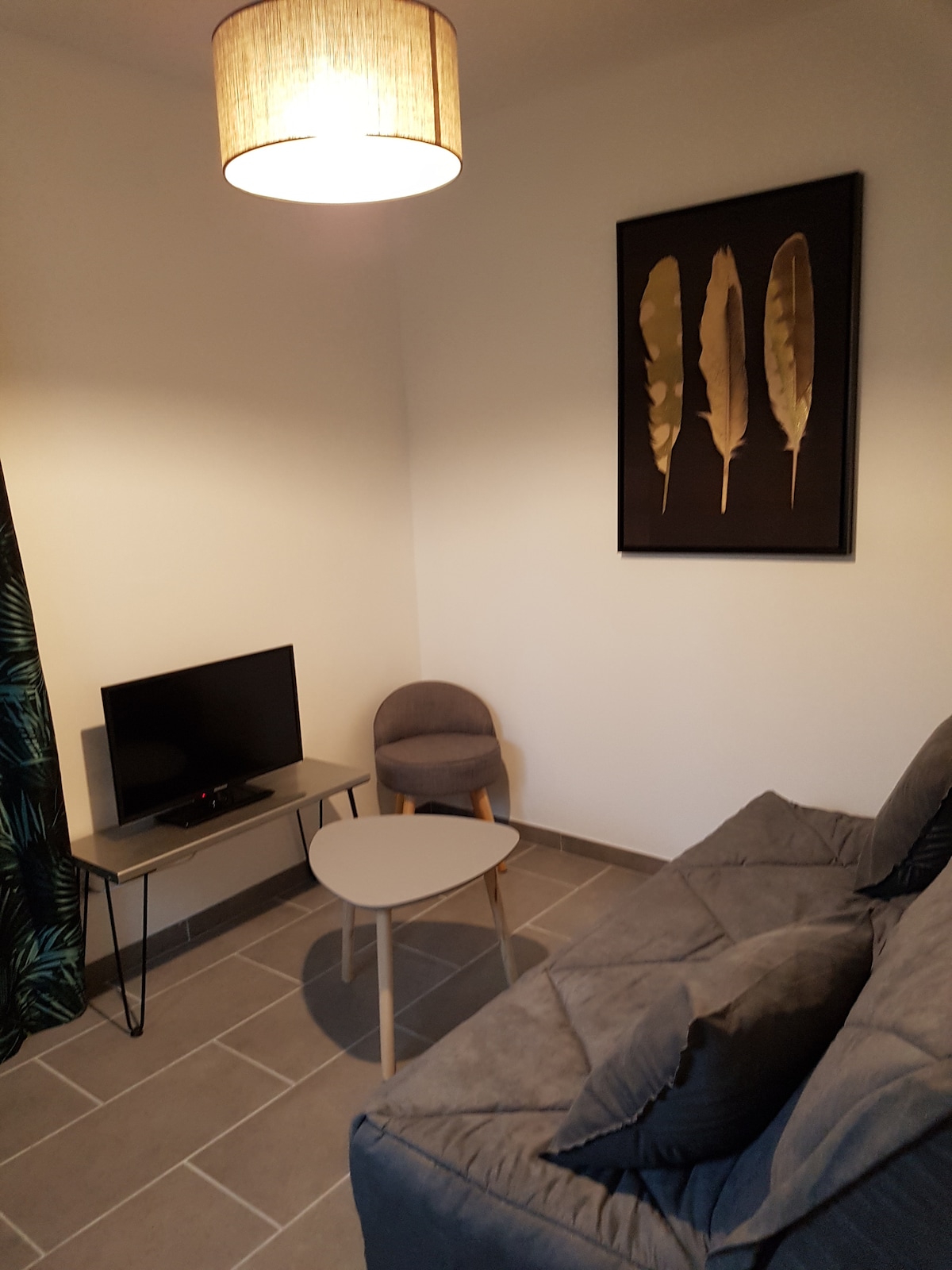 Vous apprécierez le petit coin de jardin au calme, où vous pourrez déjeuner sous le cerisier Vous aurez à votre disposition un studio indépendant flambant neuf comprenant : - une entrée avec porte-bagage, et étagères - une pièce donnant sur le jardin avec un canapé lit très confortable et fonctionnel (matelas 18cm, ouverture Rapido), une TV, une table et 2 chaises et une kitchenette - une salle d'eau avec douche, vasque et WC Vous pouvez vous garer facilement à l'extérieur de la propriété