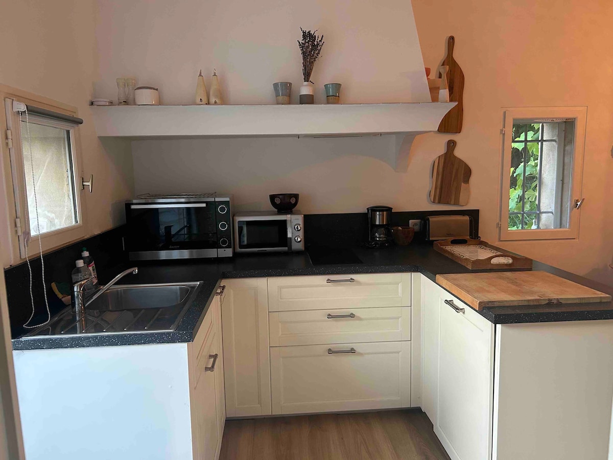 Mitoyen de la villa où nous vivons, vous profiterez de l'entrée et la vue sur les oliviers coté nord, tandis que nous donnons coté sud et piscine. Vous disposerez d'un logement climatisé avec cuisine équipée, grande salle de bain avec douche à l'italienne, une chambre ouverte avec rangements, et de la terrasse ombragée réservée pour le studio. Idéalement situé pour visiter la région, vous pourrez accéder à la piscine (l'été), profiter du jardin et y garer votre véhicule.