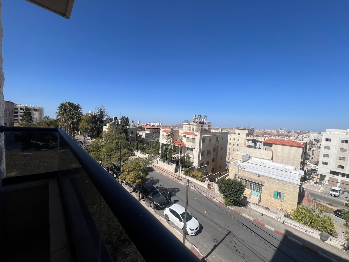 This spacious two-bedroom apartment is a 10 min walk to the city center. Enjoy easy access to transportation, nearby supermarkets, cafes, and shops, along with tantalizing Palestinian cuisine at Taghmeeseh across the street. A medical center and taxi station are also within easy reach for added convenience and stress free stay. unwind in a fully furnished space complete with a sweet balcony and fully equipped kitchen. Perfect for couples, students, small families, and business travelers.