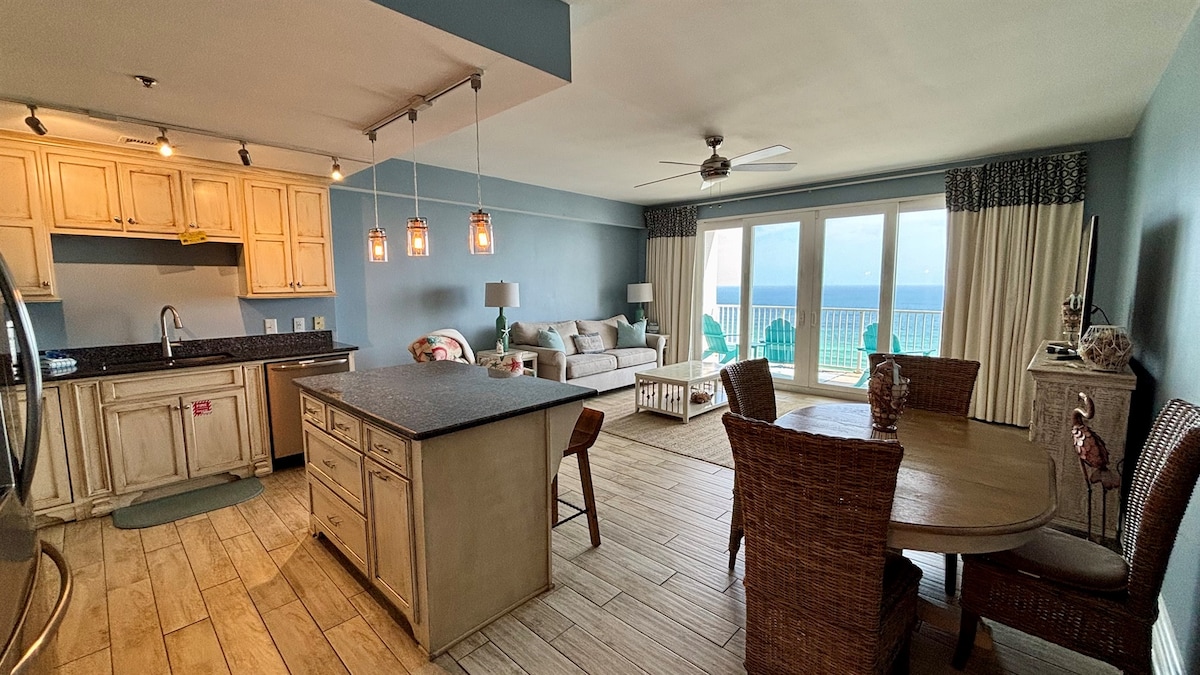 My Happy Place | 2BR + dormitori amb llitera / 2BA 15è pis amb vistes èpiques al golf! Instal·lació de platja GRATUÏTA (2 cadires + 1 paraigua, de març a octubre de 2026), a més d'accés a més de 8 cadires addicionals, més de 3 paraigües, joguines, llibres i jocs. Imagina't descansant al balcó, banyant-te a la piscina o fent una barbacoa després de la posta de sol! Wifi superràpid, 4 televisors, rentadora/assecadora, cuina ben equipada i graella al balcó. Banyera d'hidromassatge, foguera i bones vibracions incloses. Passi per al complex hoteler de 50 $ (0-1 cotxe per estada), 100 $ per a 2. Els caps de setmana s'omplen ràpidament: els preus entre setmana brillen!