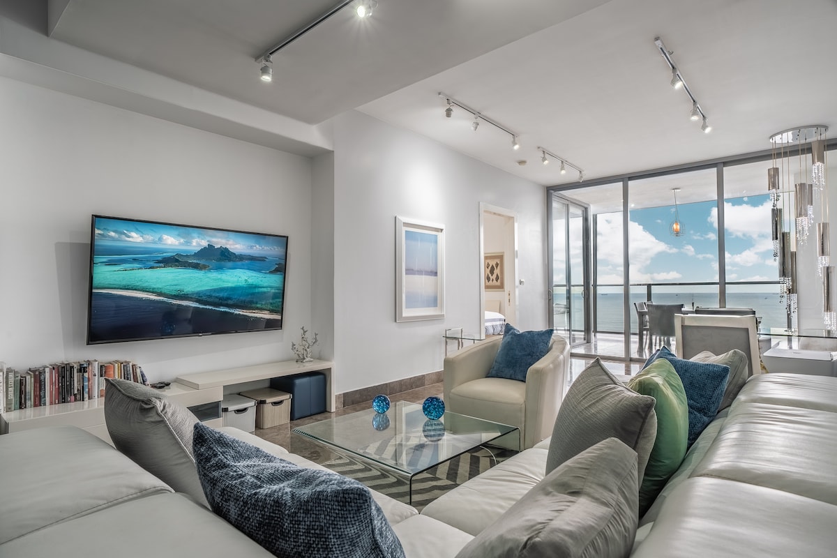 Aquest allotjament està situat estratègicament. Serà molt fàcil planificar la teva visita! Ph Yoo and Arts, situat a l'Av. Balboa, molt cèntric Aquesta propietat preciosa i moderna té un estil únic i una vista increïble al mar, planta alta, 2 dormitoris, 2,5 banys complets, bugaderia, gran terrassa, llums cèntims a tot l'espai, menjador, sala de cinema, espai de treball, 3 televisors intel·ligents, 3 aires condicionats centrals, cuina totalment equipada, vidre modern.