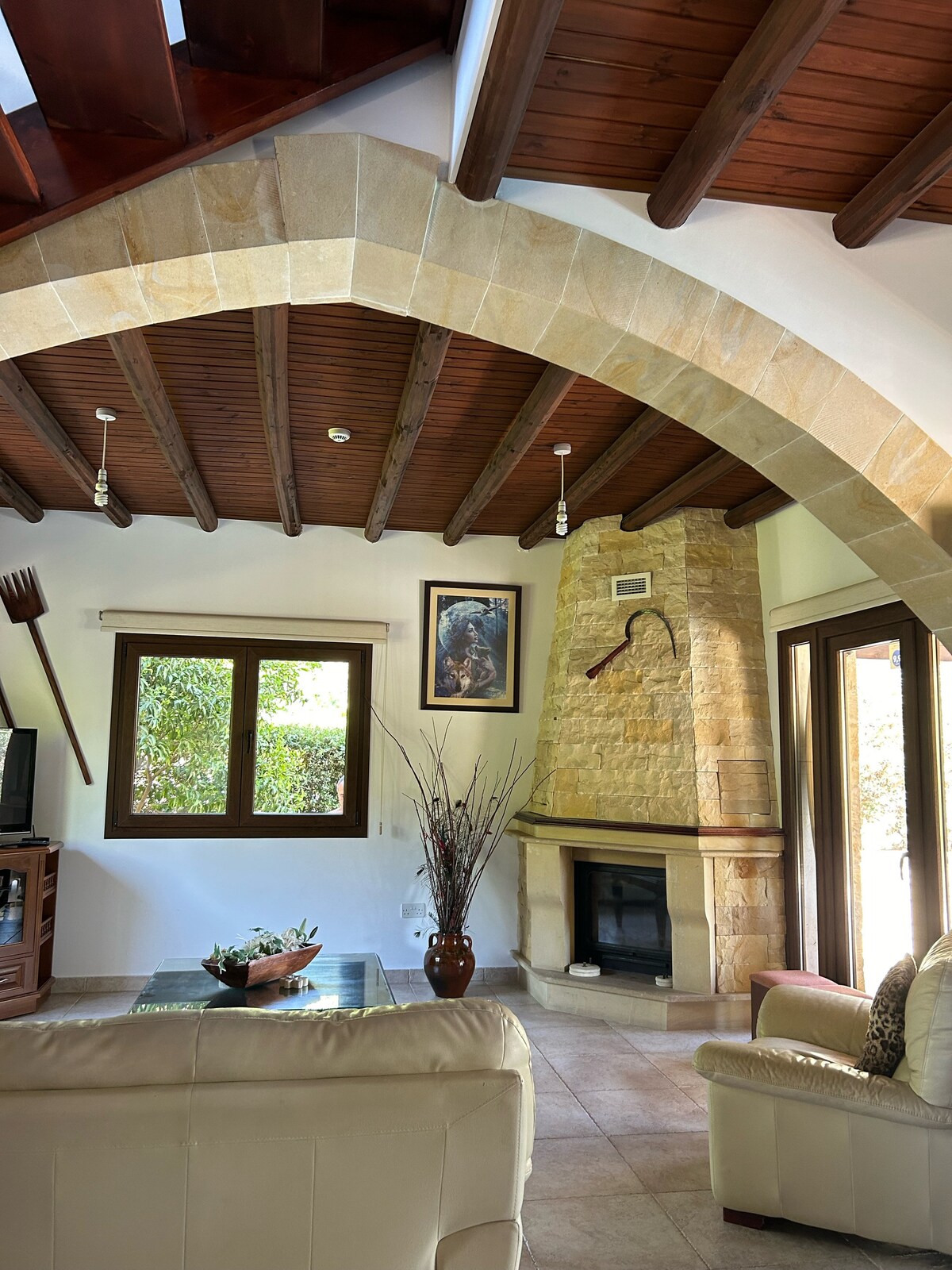 Situat a l'alçada de les muntanyes de Pano Panayia i a pocs passos de la bodega Vouni Panayia. La Casa del Vi és ideal per als amants del vi, la fotografia, el ioga o qualsevol persona que vulgui escapar del bullici de la ciutat i relaxar-se en aquest espai tranquil i elegant. La casa està envoltada de vinyes de la zona i dóna a les postes de sol, on pots gaudir d'unes vistes panoràmiques impressionants igualment populars per a famílies, parelles o viatgers individuals.