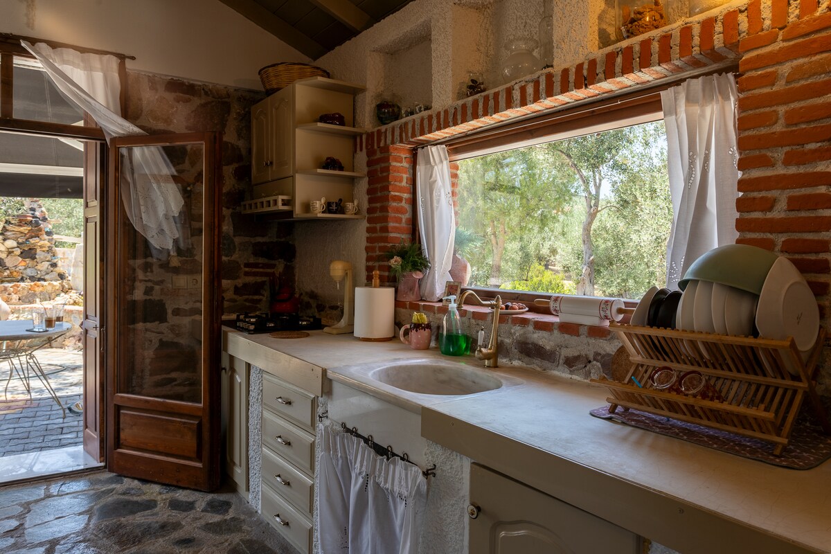 Una preciosa finca d'oliveres de 55 metres quadrats a l'illa grega de Lesbos (Lesbos), en l'abraçada de l'increïble golf de Gera, a la part sud-est de l'illa. Un refugi d'harmonia, tranquil·litat i tranquil·litat, a primera línia de platja de les aigües blaves cristal·lines del golf, on es pot nedar i relaxar-se sota els oliveres i pins amb una sensació única de privacitat, a només 10 minuts de la ciutat central, port i aeroport de Mytilene. Allotja 2 adults i fins a 2 nens