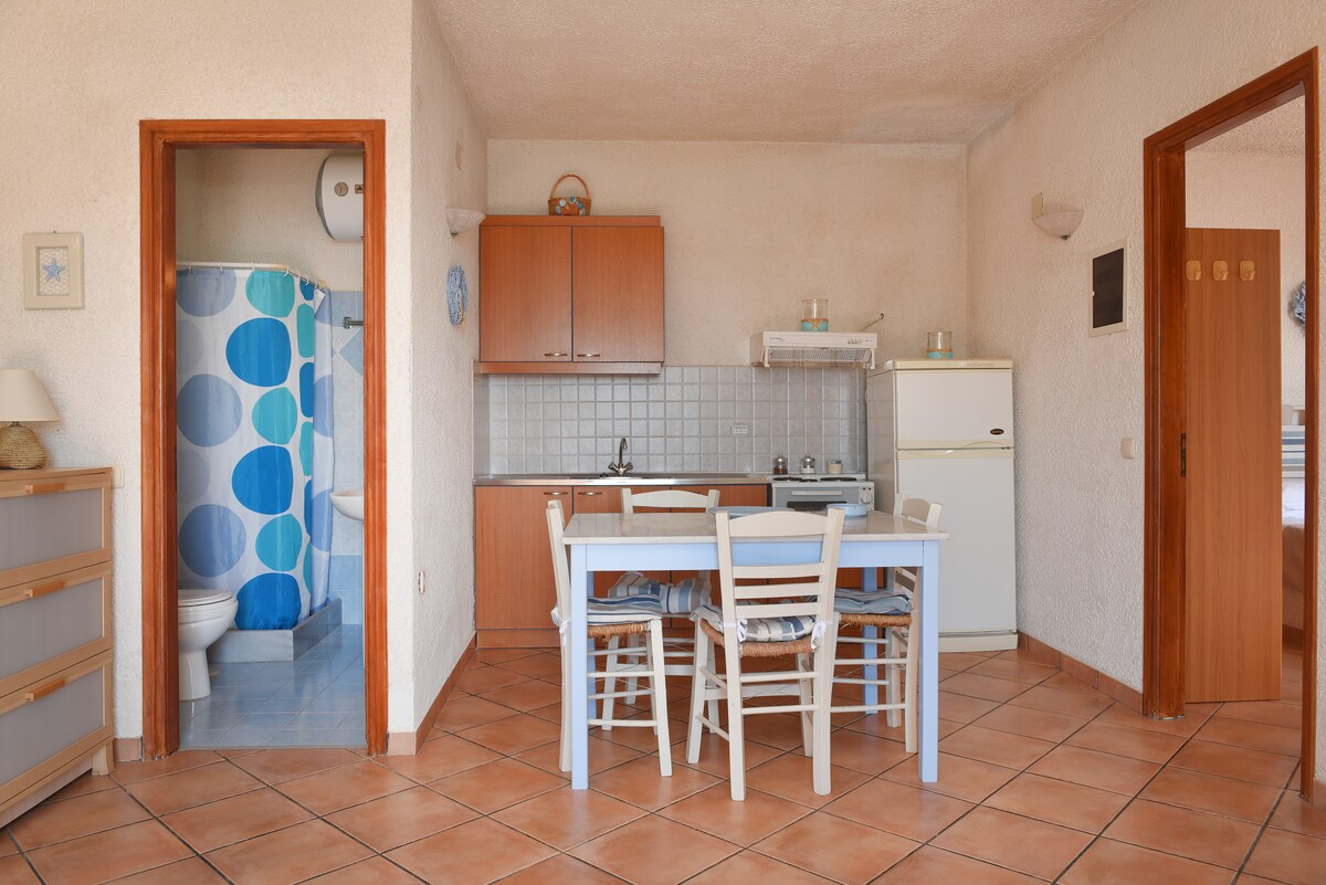Pis d'un dormitori totalment equipat amb vistes frontals al mar. Un llit doble al dormitori i un sofà llit a la sala d'estar, cuina totalment equipada (forn, nevera-congelador, rentador de plats, 4 fosses), bany amb dutxa , rentadora, terrassa privada amb cadires i taula. Accés a un pati compartit amb accés directe al mar (roques) on els hostes poden banyar-se al matí. Vista frontal al mar des de l'habitació i el dormitori. A pocs passos del centre d'Ermòpolis.