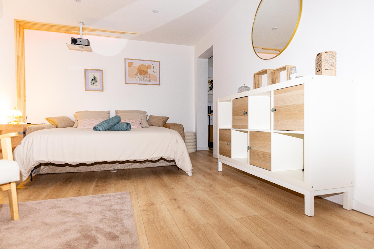 Vine i passa una nit de somni amb la persona que més t'agrada, en aquest allotjament tranquil i elegant de 50 m2. Esperem sincerament que gaudeixis d'aquest espai, les paraules clau de la teva estada seran amor, relax i descans. Per a això, t'esperen una habitació amb banyera d'hidromassatge i una dutxa. A l'altra sala gaudireu d'una cuina real amb sala d'estar. Estem situats a Dole, una encantadora ciutat gastronòmica i cultural del Jura.