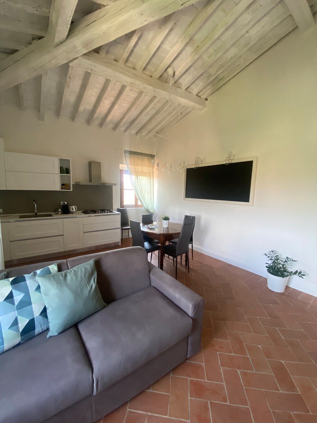 Pis d'estil provenzal envoltat de vinyes i oliveres. Gaudiràs de la tranquil·litat del camp a 10 km de la ciutat i a 4 de l'autopista. El cant de la bellota i el cuco serà la banda sonora de la sala d'estar mentre els cérvols cremen entre les oliveres. S'inclou un esmorzar bàsic italià (cafè, te, llet, galetes, etc.). Si prefereixes un esmorzar més ric i servit a la taula, el cost és de 15 € per persona (10 € de 5 a 15 anys, gratuït per a menors de 5 anys). Hi ha un carregador de cotxes elèctrics disponible.