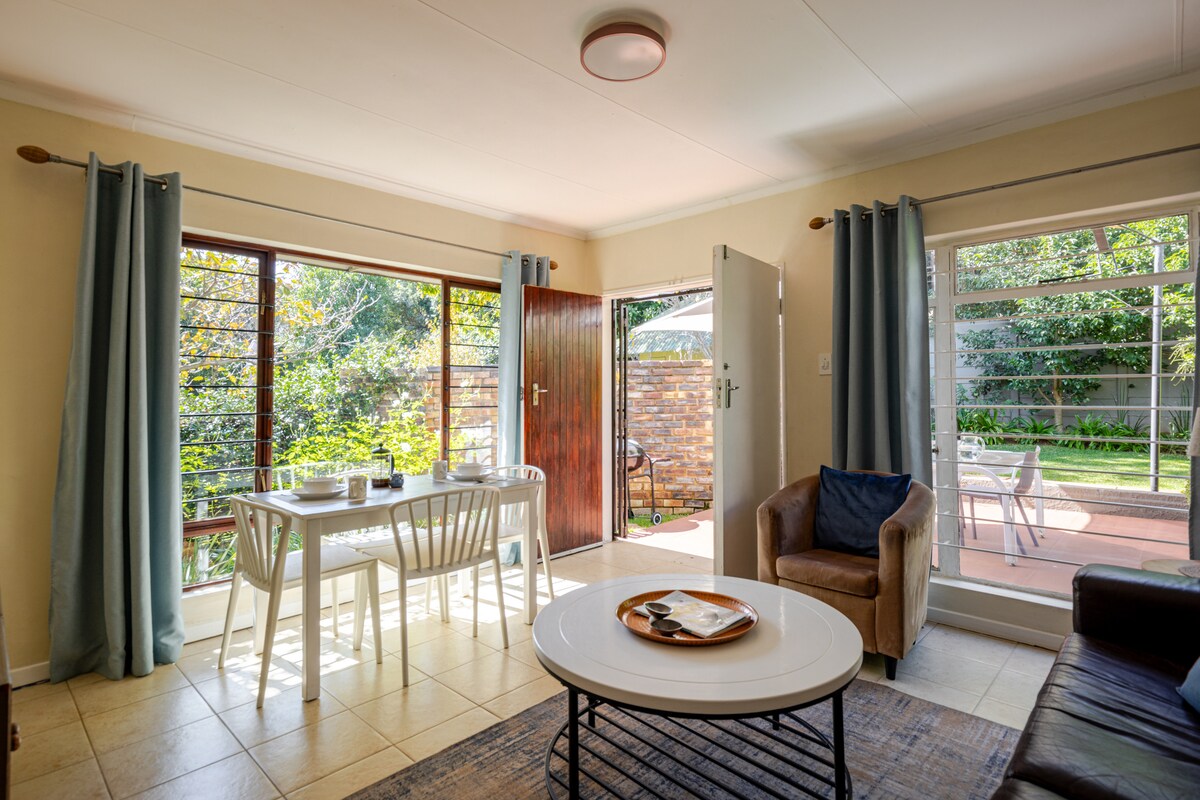 Sunny and spacious private cottage set in quite leafy garden with its own private entrance and Patio. Solar power means that load shedding is no issue. It comfortably accommodates two people in a queen sized bed. Offers a kitchen with granite counters and induction cooking plates as well as microwave and fridge. smart TV (Netflix), Desk / breakfast bar with USB connected plugs. Free Fiber 100Mbs Wifi. Large closet as well as bathroom with high pressure shower and separately enclosed toilet.