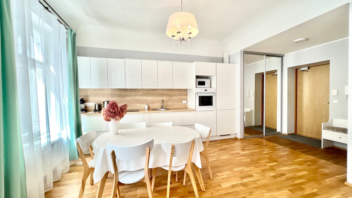 Gorgeous 100m2 rooftop apartment with a sauna and balcony at the very heart of Pärnu. Nestled in the historic Old Town, its location is as central as it gets – ideal for those who want experience the city's rhythm while enjoying a comfortable stay. The apartment is located on the last floor of one of Pärnu's most historical buildings, built in 17th Century and has a balcony with a magical view over Old Town rooftops. Stylishly renovated, has all modern comforts & an inner courtyard for parking.