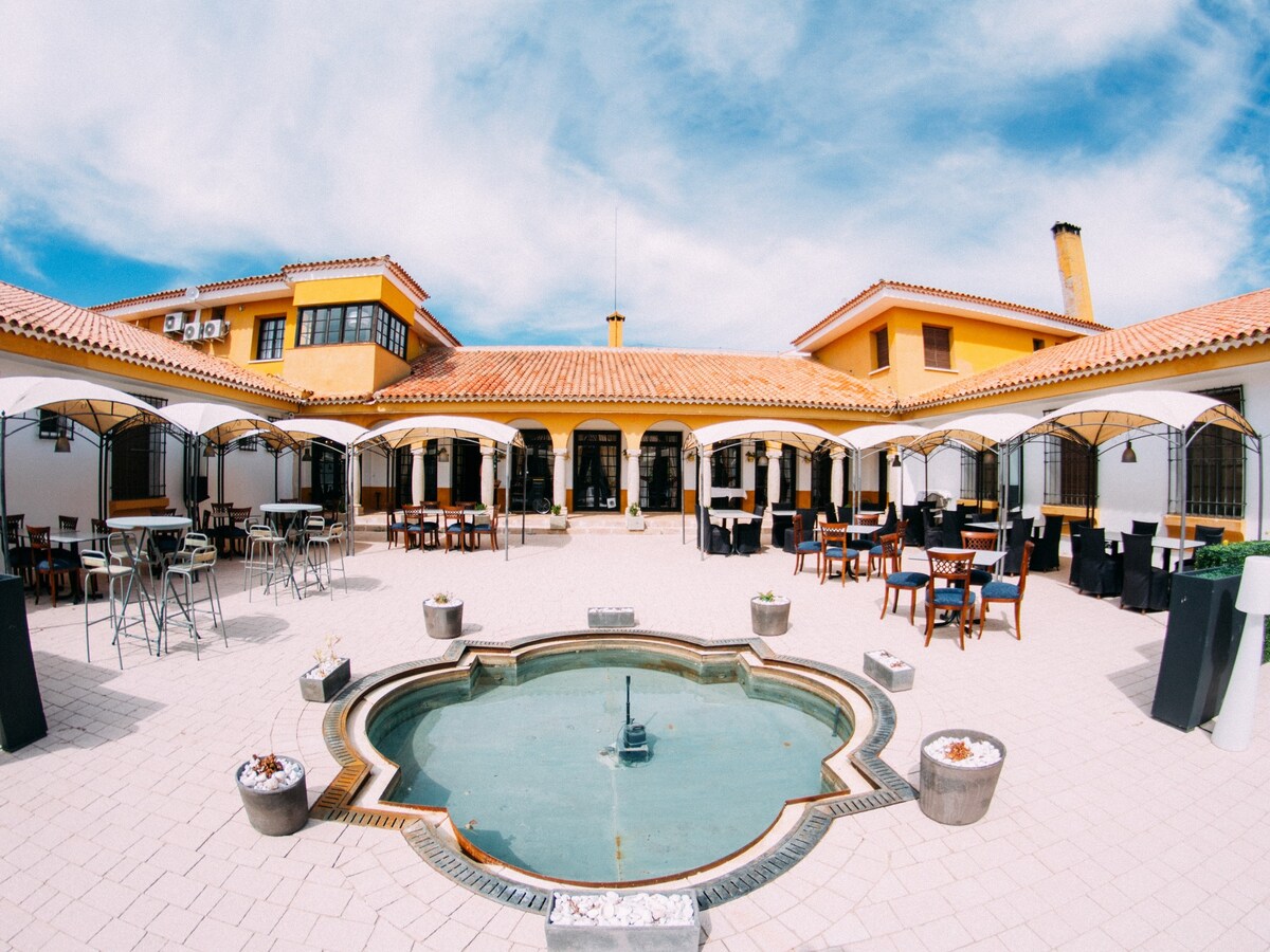 Si buscas un lugar tranquilo para descansar ponemos a tu disposición un hotel único en toda Granada. Edificios históricos con amplios patios y jardines, rodeados de olivares y campos de trigo… la belleza de Andalucía se respira en cada rincón del Cortijo del Marqués. Disfruta de esta romántica habitación situada en lo más alto de la Torre con vistas en todas las direcciones. Techo alto de madera y un cuarto de baño amplio con ducha y bañera de patas. Acceso por una escalera empinada.