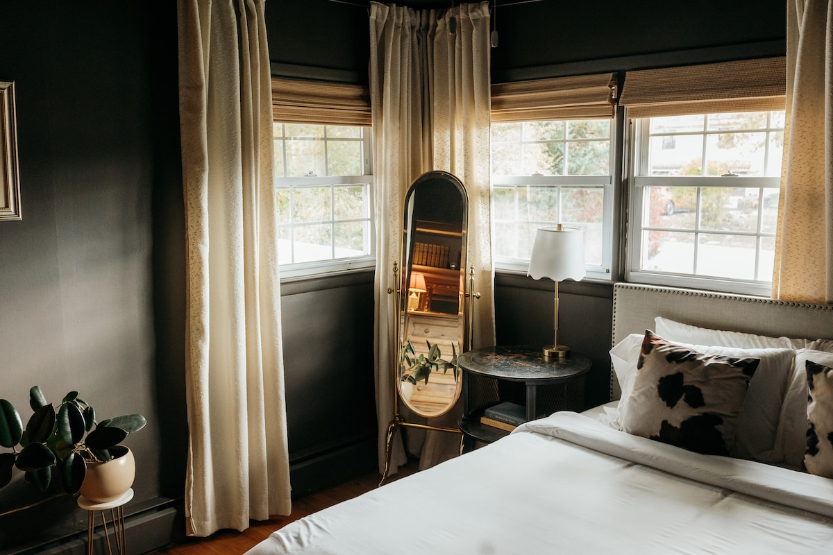 A cozy corner bedroom with windows on two sides, vintage details, and a warm electric fireplace. The Hearth Room blends moody cottage style with comfortable linens, wood floors, and thoughtful touches for a peaceful Hudson Valley stay.