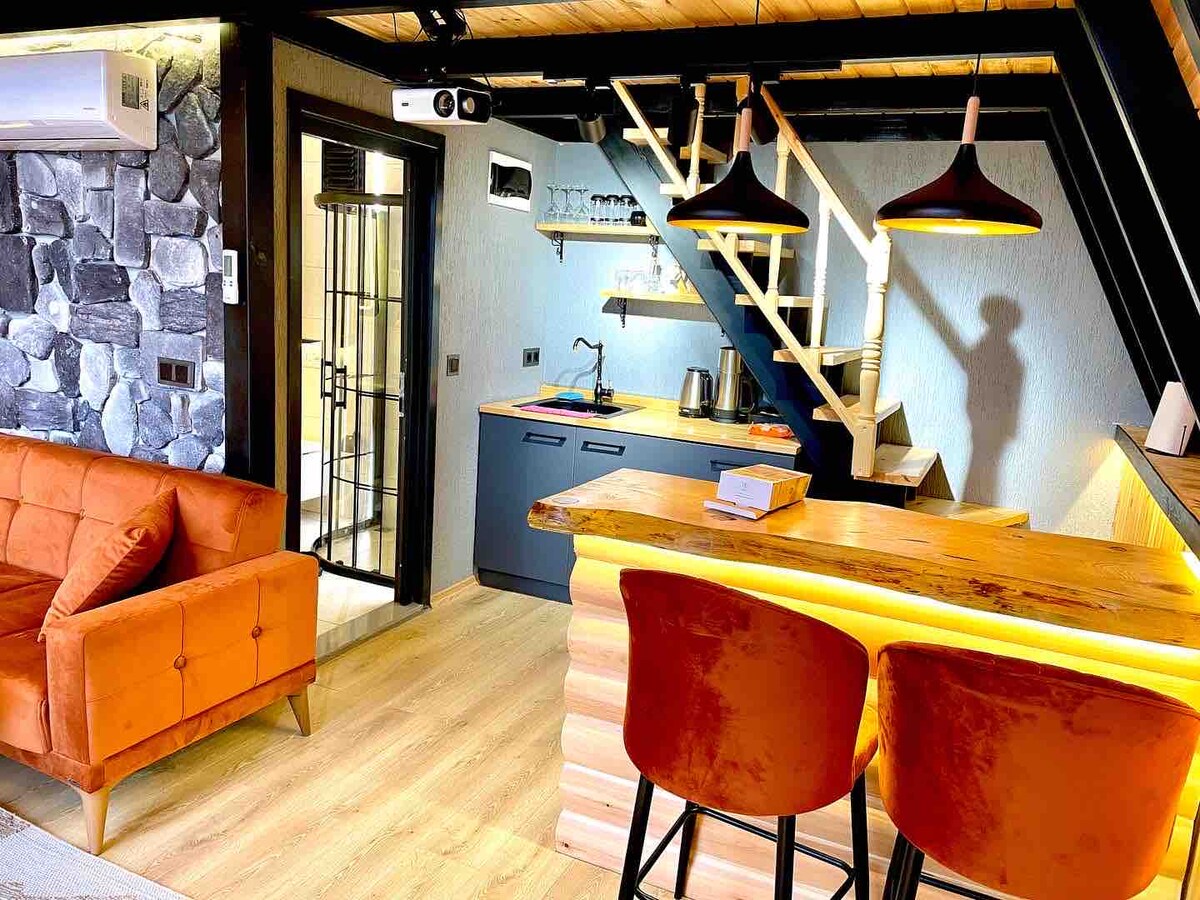 - La nostra casa bungalou ha estat dissenyada completament de fusta i autèntica. - La nostra casa de bungalou té una llar de foc i té magnífiques vistes a la vall i a la muntanya. - La nostra habitació té una amplada de 45 m2. - És un concepte que les parelles de lluna de mel poden triar fàcilment. - La planta baixa té la forma d'una sala d'estar; hi ha un llit doble a la planta superior, com ara un balcó, un sofà, un bany, una televisió, un minibar, etc.