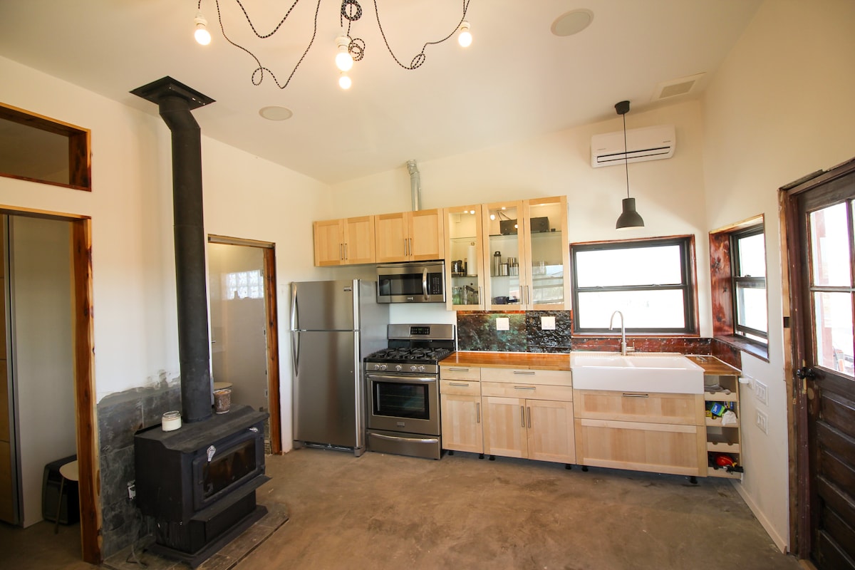 Descobreix la nostra casa ecològica Earthship amb banyera d'hidromassatge, vistes increïbles, sala d'estar, menjador i espai de treball moderns de mitjans de segle. Espai de spa/ioga i postes de sol increïbles sobre la ciutat i les muntanyes Jemez. Aquest espai és un món a part, però a només uns minuts de la ciutat. Viu una experiència sostenible amb els nostres jardins interiors relaxants que es barregen a la perfecció amb els ginebres i els piñons que els envolten.