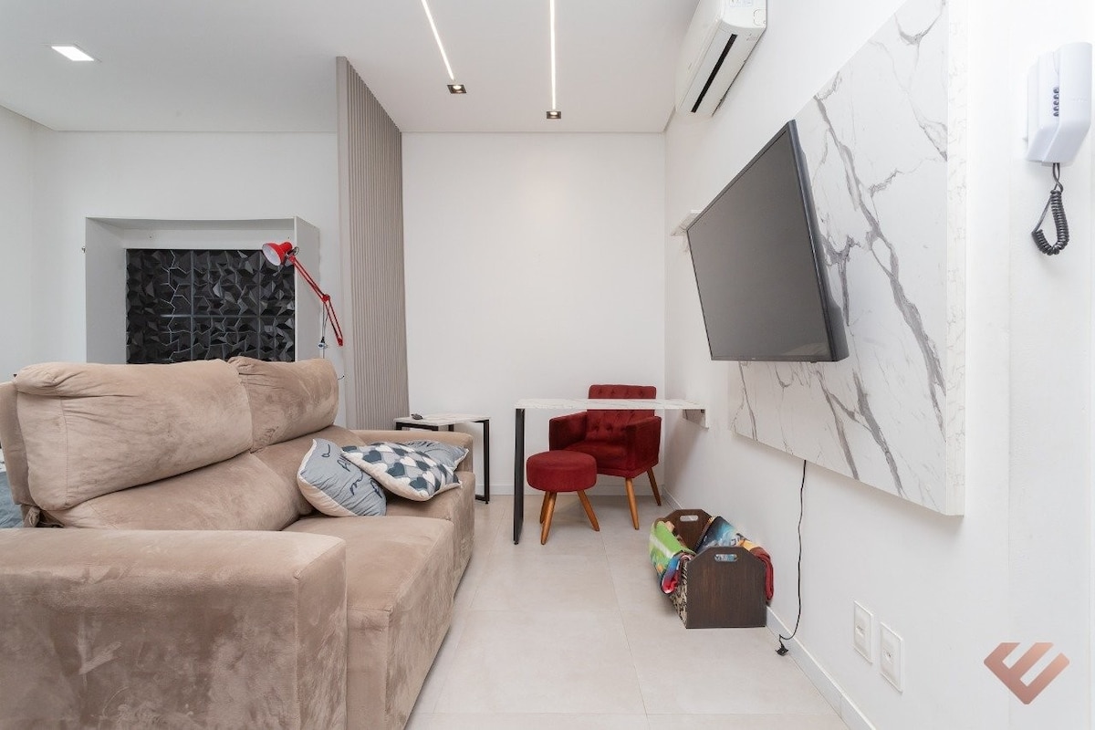 Gaudeix d'una experiència elegant en aquest lloc ben situat! Loft nou i complet al cor de Pelotas: - Mercat nacional 4U. - Llençols i llençols de bany inclosos - Cuina completa - Llit «queen size» - Aparcament gratuït inclòs. - Sofà llit per a una persona - Dutxa de gas - Finestres automàtiques - Aire condicionat - Televisor intel·ligent de 43 polzades - Internet de 200 MB - Balcó ample - Ascensor - Vista del camp del Brasil des de Pelotas a la terrassa.