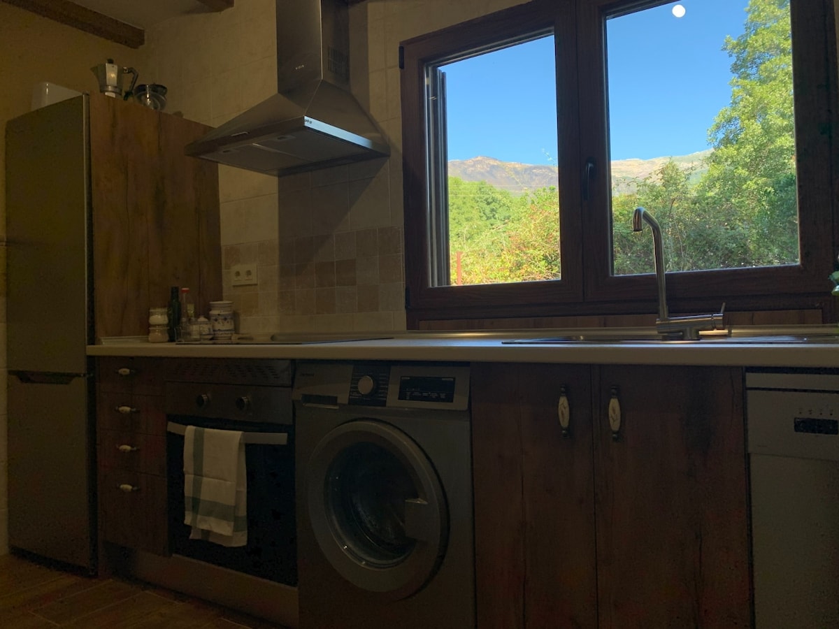 Casa independent ideal per a parelles i famílies petites. Aparcament privat i jardí, no compartit, porxo i barbacoa No és una habitació, és una casa rural preciosa. Habitació de concepte obert. Zona d'estar davant de la llar de foc i televisor intel·ligent, menjador amb cuina integrada, bany complet, pica doble i bonic dormitori amb llit XXL. Al costat de la sortida 375 de l'A66. Descansa ideal entre el nord i el sud Mira si vens amb un animal de companyia. La piscina està a 100 metres i és comunitària