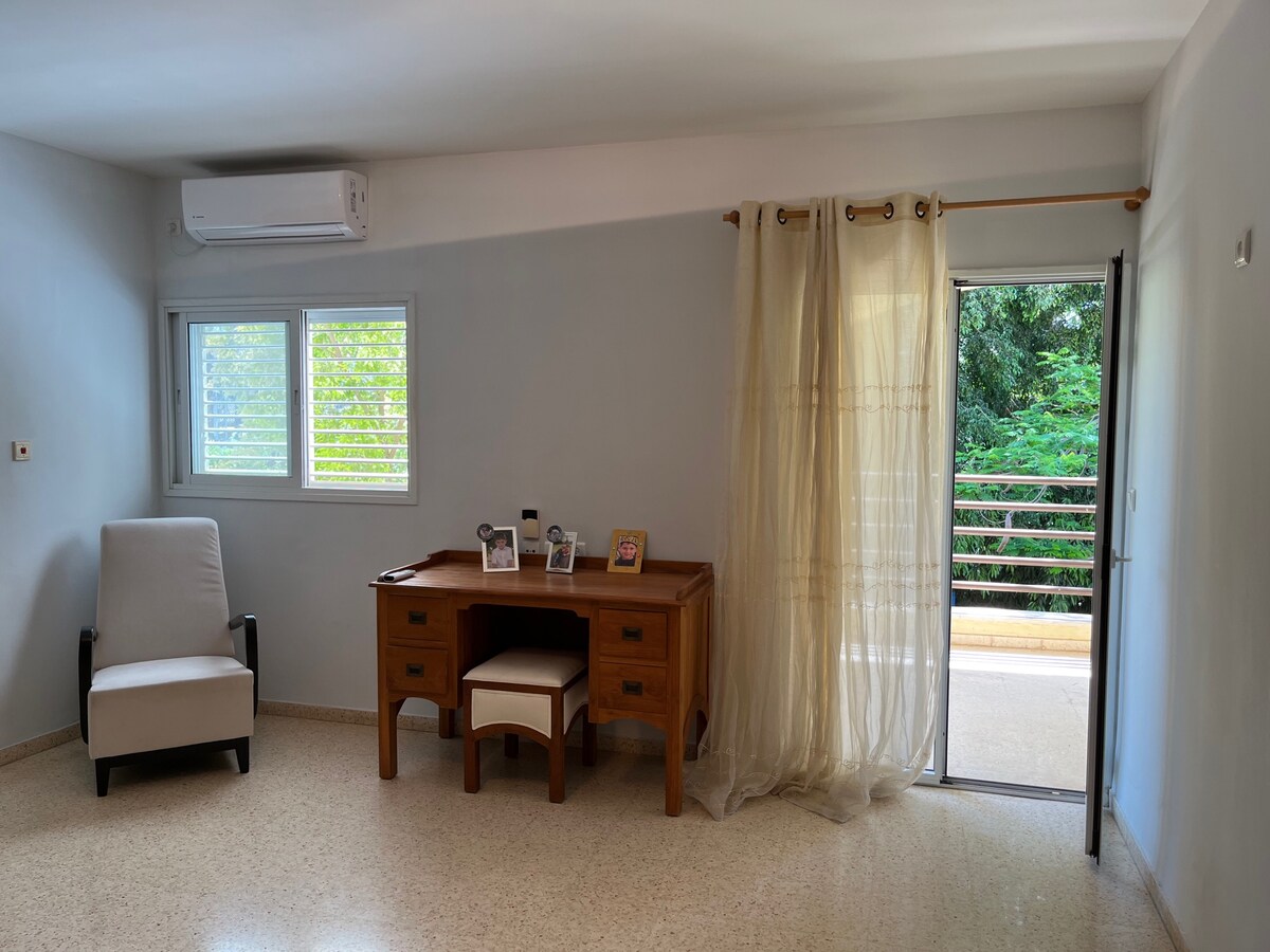 Gran habitació (amb pany) al meu apartament tranquil que té rentadora+assecadora, cuina totalment equipada, aire condicionat+ ventilador de sostre, aigua calenta les 24 hores. L'habitació té TV de pantalla plana amb NETFLIX gratuït, wifi gratuït, .Queen+ llit de mida. Cortines opacades, situat en un dels suburbis de Tel-Aviv. A 15 minuts en cotxe de l'aeroport i del centre de Tel Aviv. Aparcament gratuït. Viatges disponibles . Tindràs el teu propi bany i vàter.