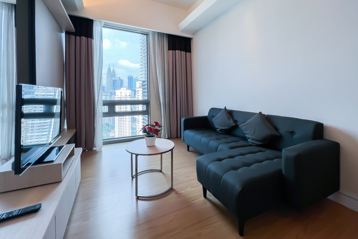 Stylish 1BR sky suite with a private balcony facing KLCC and KL Tower. Enjoy sky dining from your balcony while watching the dazzling light shows from both iconic towers every night. King bed, rain shower, full kitchen, washer with drying rack, Netflix, high-speed WiFi. Relax at the infinity pool, rooftop jacuzzi, and gym. Walk to Jalan Alor, Pavilion, Bukit Bintang, and the new TRX Mall. 24-hour check-in. Airport pickups and local tours available. Your perfect KL stay begins here!