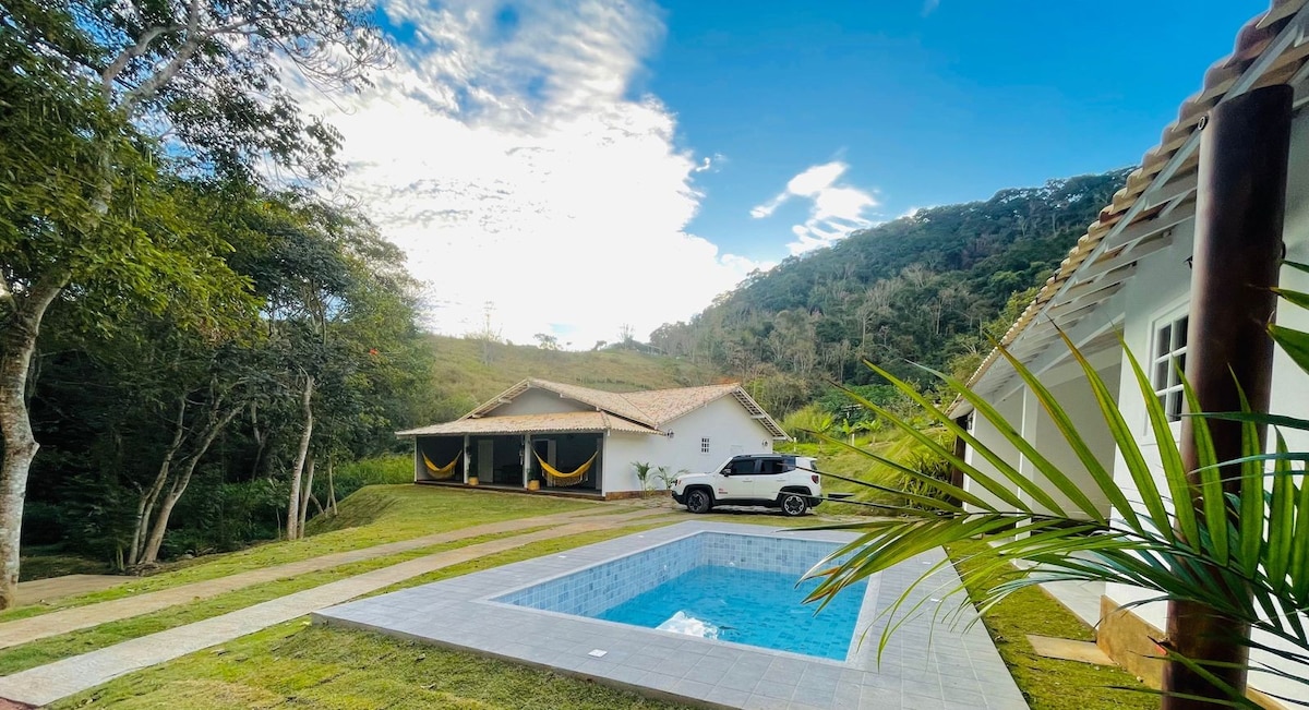 Refugi per a aquells que volen entrar en una immersió total en la Natura . Casa desplegada amb vistes als quatre costats . Pico do Cuca , Cachoeira, Floresta i posta de sol enlluernador . Just a l'entrada sentiu una curiositat incontrolable per conèixer cada entorn . A la planta baixa tenim la cuina petita però encantadora, habitacions amb boniques vistes, banys amb cara de casa de dolls i menjador des d'on pujar una petita escala arriba a la sala de TV o baixar a la sala d'estar i llar de foc . Imagineu-vos : Il·luminació d'una xemeneia Tallada en una gran pedra ,que dóna suport a la casa i que mira uns metres davant seu després del riu fins a un bell bosc . Tot aquí és una sorpresa encara que no vulguis marxar .