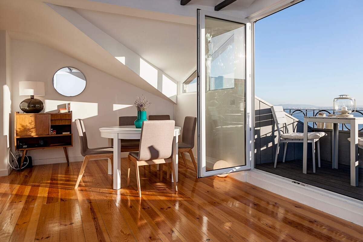 Situat a la planta superior de l'edifici, disposa d'una terrassa amb unes vistes impressionants sobre el riu Tajo i la ciutat de Lisboa. Aquest encantador pis de dos dormitoris (amb aire condicionat i finestres de doble vidre) està situat en una de les zones més populars de Lisboa, just al costat del famós «Elevador da Bica». Alguns dels millors museus, llocs d'interès, miradors i botigues són a poca distància a peu. El transport públic és fàcilment accessible (l'estació de metro Baixa-Chiado és a només 450 metres).