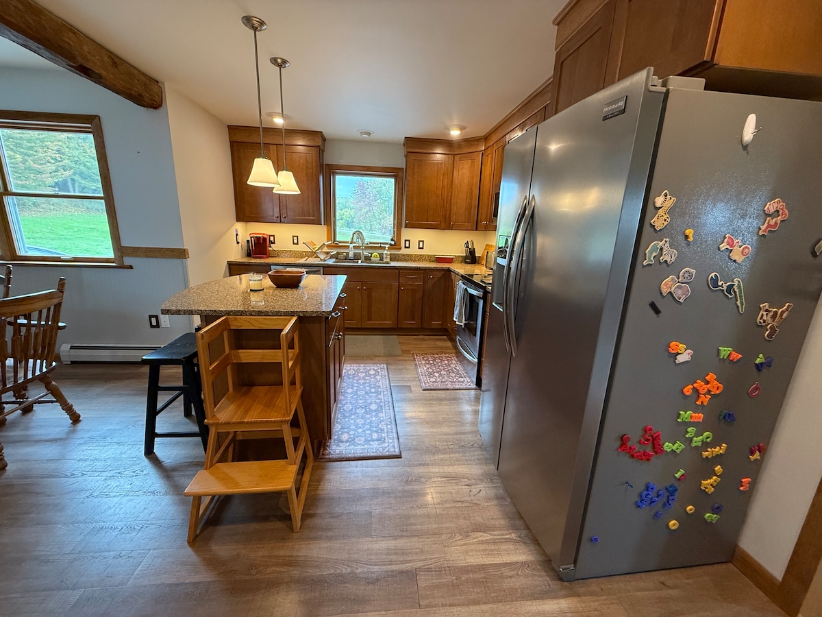 La casa està amagada a la part posterior de la nostra granja lletera de 300 hectàrees i ofereix vistes impressionants de la muntanya. Mansfield. Estem situats entre dues de les millors estacions d'esquí de Vermont, Jay Peak i Smuggler Notch. Vine a gaudir d'una aventura d'hivern plena d'esquí de baixada, equitació o recorregut en x-country. Allotja't per a les cerveseries, destil·leries i restaurants locals. O simplement relaxa't a la granja, acollir-te al costat de l'estufa de llenya i cuina un deliciós menjar de la granja per sopar. Els gossos que es comportin bé són benvinguts en qualsevol moment!