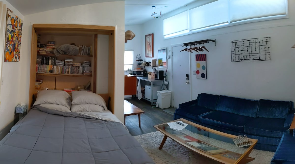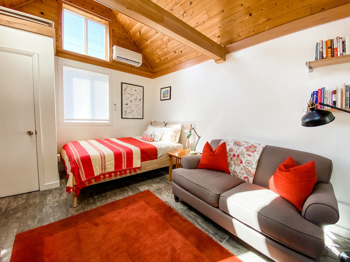 Es tracta d'un estudi de 600 peus quadrats amb 1 llit queen, 1 sofà que es dirigeix a un llit complet, un menjador, una cuina petita, una calefacció/aire condicionat sense conductes i un bany amb banyera i dutxa. Té una entrada privada i puja per 1 tram d'escales. L'apartament és tranquil i disposa de wifi i televisor. La parada d'autobús de la ruta 6 es troba just a l'altre costat del carrer. No es permet fumar, no s'admeten animals de companyia i tots els nens han de tenir 5 anys o més. Despeses de neteja addicionals per a estades de 2 setmanes o més. Consulta altres detalls.