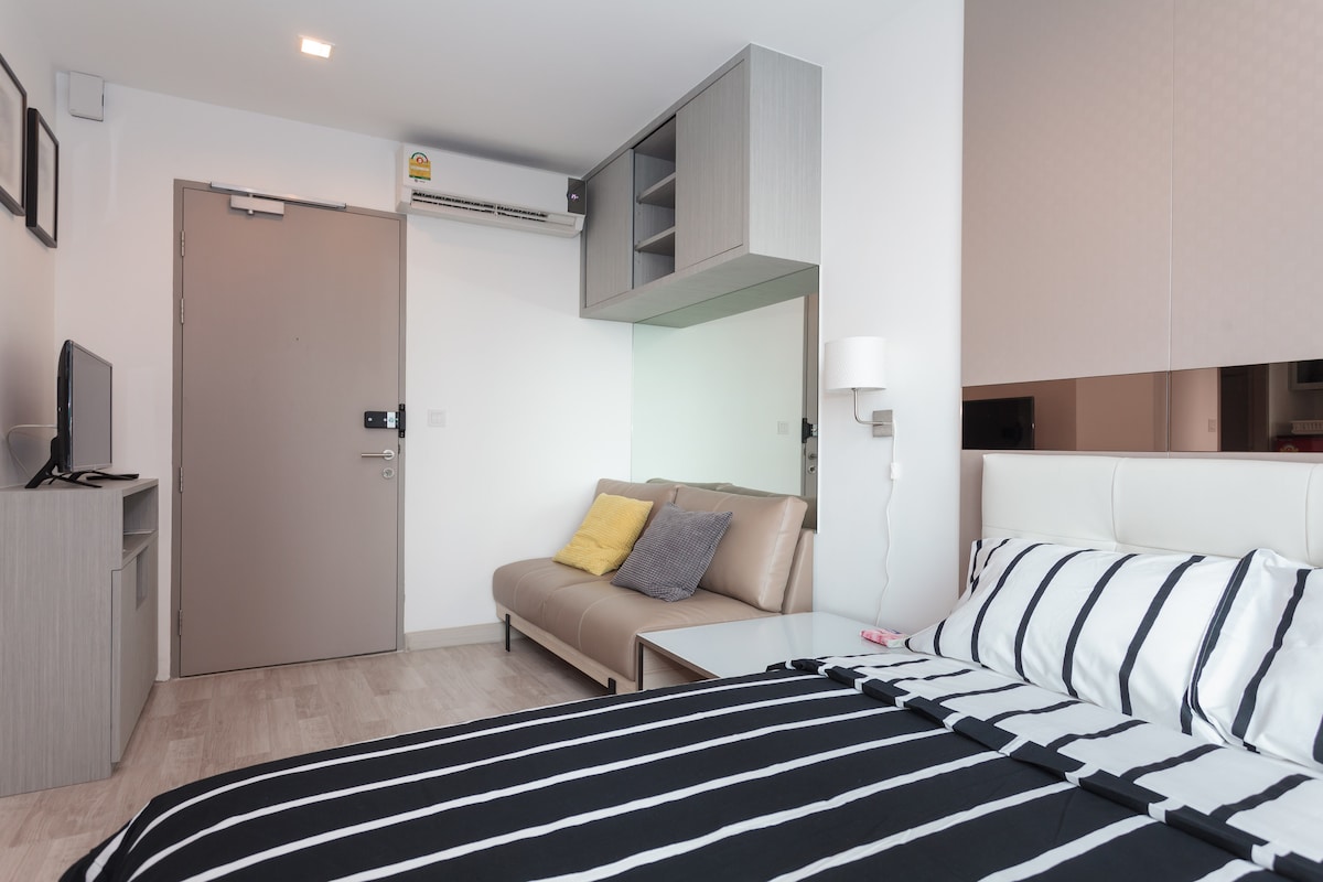 Allotjament contemporani a prop de l'estació BTS Onnut (E9) a només 5 minuts a peu o a 300 metres. És molt fàcil moure 's i a només 15 minuts del centre de la ciutat. Pis de 1 habitació totalment moblat amb llit de mida queen, sofà còmode a la sala d'estar moderna, taula de menjador, armari gran, tocador. Fogons de ceràmica amb campana extractora, rentadora i caixa forta digital (caixa forta). Bany amb mampara de dutxa de vidre temperat. Pany digital a la porta. Wifi gratuït i Netflix!! Molt còmode i acollidor per a estades llargues o curtes.