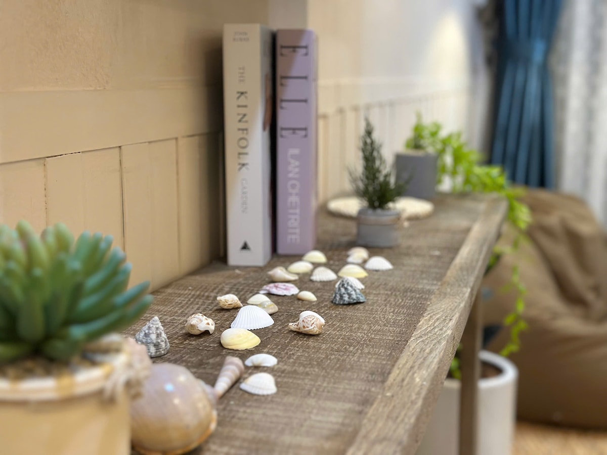 This apartment is a gentle mix of Japanese simplicity and Vietnamese soul. The highlight is the straw-textured wall finish, adding a natural touch that runs throughout the space. Warm yellow lighting from soft decorative lamps creates a calm, inviting glow. The bedroom area is slightly elevated, set apart from the kitchen and dining space to create a subtle visual interest. Outside, a spacious garden brings in fresh air and greenery, perfect place to unwind,sip tea or simply listen to the quiet.