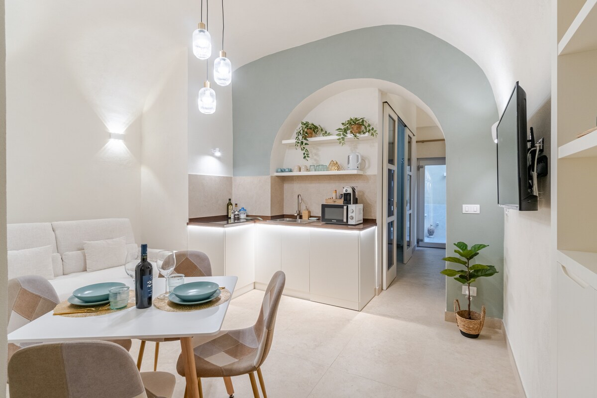 El pis, totalment reformat i reformat en el mobiliari el 2020, està situat en una cinquena i darrera planta a la qual es pot arribar sense ascensor. Aquesta característica la fa molt lluminosa i panoràmica, amb vistes a la ciutat i al mont Vesubi. Una singular exclusivitat que es troba en un allotjament del centre històric. El mobiliari és nou i modern sense oblidar els seus orígens històrics i en contraposició a un antic edifici ruïnós que data del segle XVII.