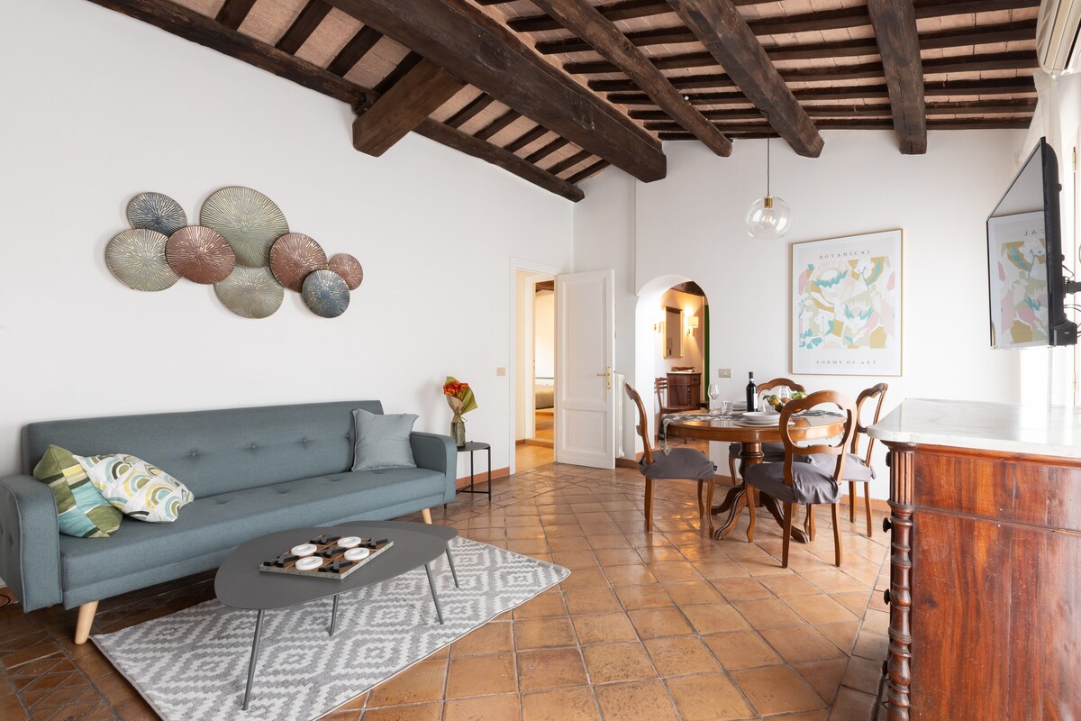 Et donem la benvinguda al pis de Cancelleria, situat al cor del centre històric de Roma! Aquest pis recentment reformat ofereix una barreja única de comoditat moderna i encant històric. Què t'encantarà: - Ubicació immillorable amb vistes al Palazzo della Cancelleria, el palau renaixentista més bonic de Roma, construït per Bramante(1486 AD). - Completament reformat el 2024, amb una decoració contemporània de primer nivell. - Llit «king size» (180 x 200 cm) i sofà llit amb matalàs de 20 cm per a la màxima comoditat. - Sostre de fusta original que data de segles.