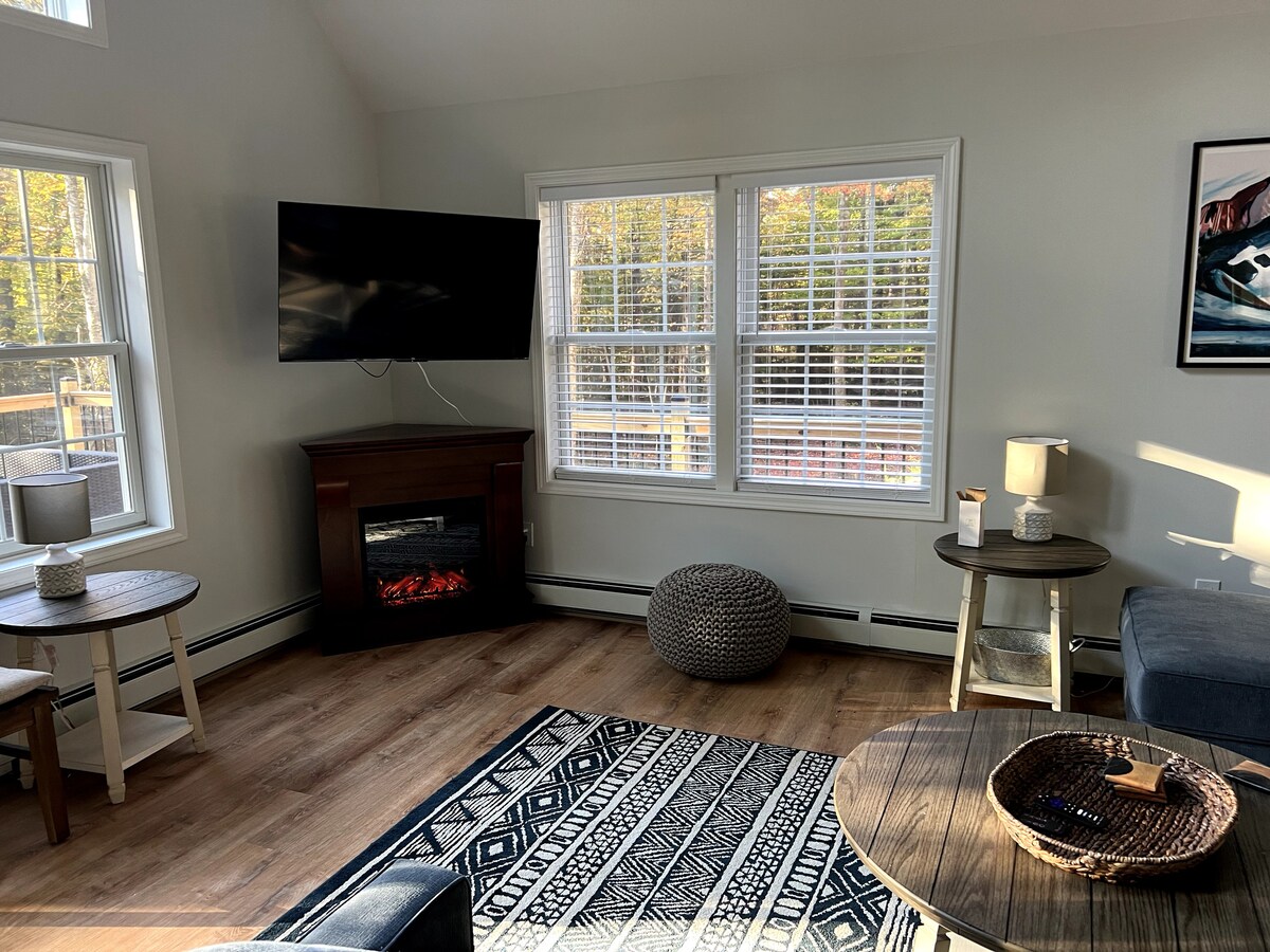 This boutique tiny home is situated in the picturesque Upper Valley of Vermont. The nearly 50 acres of private land is equal parts woods and water. You will wake to the mooing of dairy cows. Have your coffee on the porch while watching birds dive for their breakfast on the pond. Inside you will find every modern amenity. A fully appointed chef's kitchen. A living area filled with comfy furnishings and a cozy fireplace. Upstairs is a queen bedroom with an ensuite double showered bathroom. Heaven!