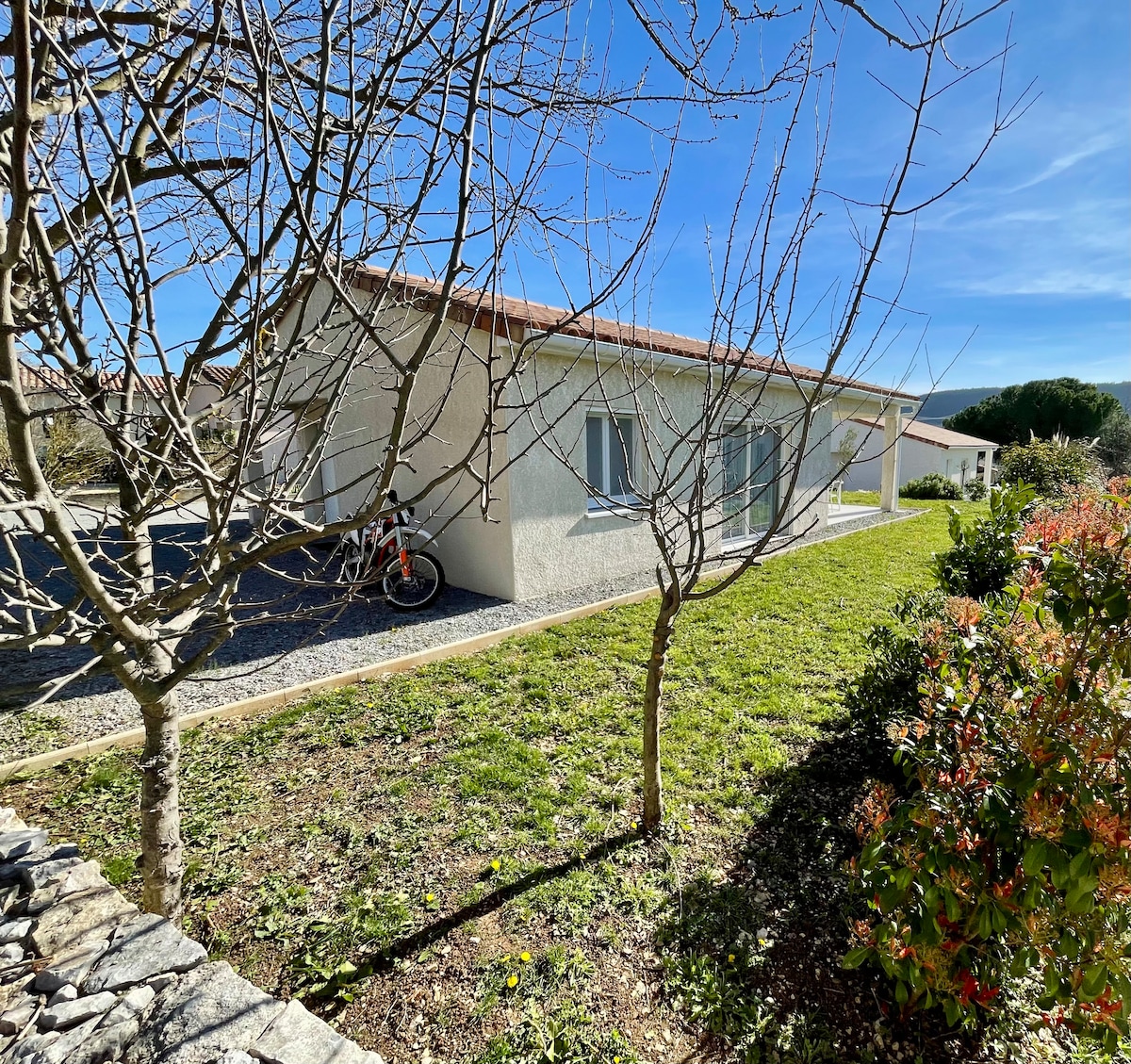 Modern allotjament amb sala d'estar, 2 dormitoris (2 llits dobles), una cuina moderna totalment equipada. Sòl climatitzat refrescant, calidesa. Aire condicionat. Terrassa de fusta exòtica al costat nord, així com un pati amb vegetació al sud. A prop de Commerce , Lake Health Course, Municipal Olympic Pool, entre el Drôme Provençale i les Gorges de l'Ardeche