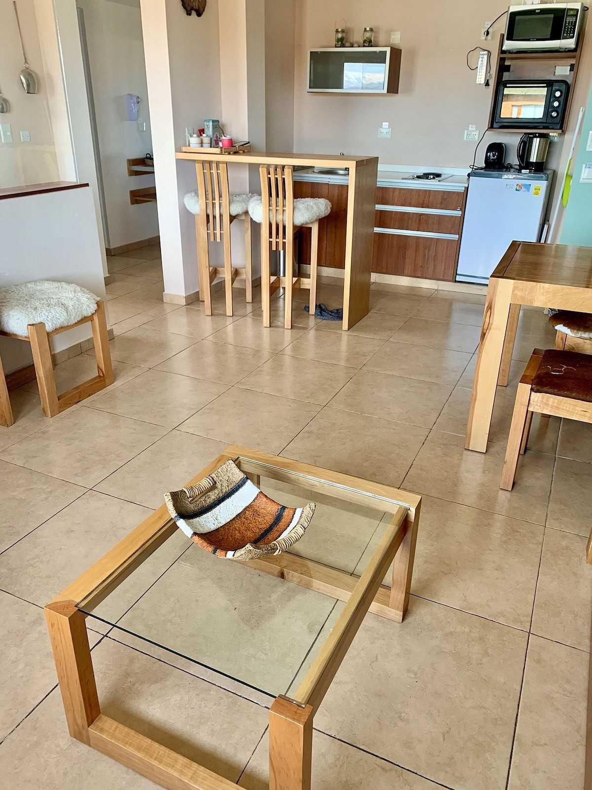 Exclusiu loft d'un dormitori per a 4 persones a la segona planta davant del llac Nahuel Huapi amb vistes a Bariloche i a les muntanyes. Disposa d'un dormitori amb un llit doble i un sofà llit doble (llit + carretó) a la sala d'estar (subdividit amb vidre). L'apartament està molt ben equipat, amb cuina elèctrica, forn elèctric, torradora, cafetera, forn microones, nevera i assecador de cabells.