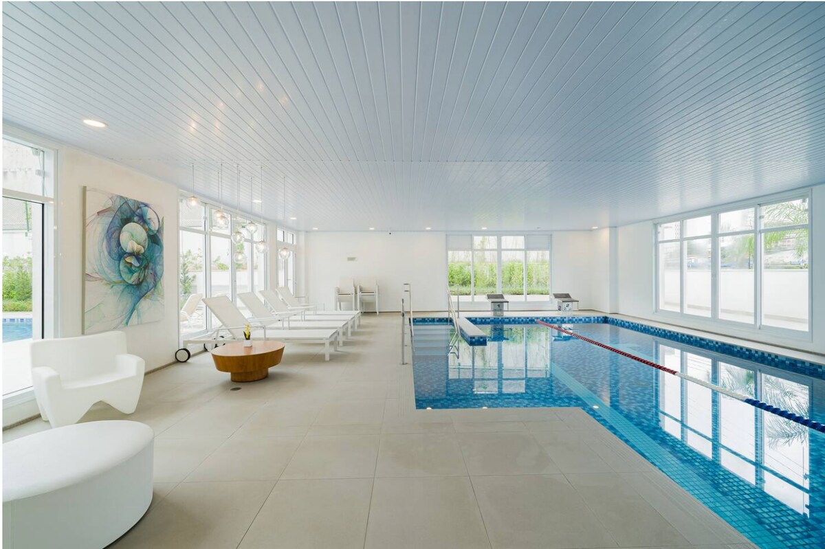 Estudi boutique amb una de les vistes més boniques de la ciutat de São Paulo. Es troba a 2 minuts a peu del metro. Cuina totalment equipada amb nevera amagada per una porta de fusta. Wifi, aire condicionat i televisor intel·ligent de 55 polzades. Accés independent amb pany electrònic intel·ligent. Juga al tennis o ves al gimnàs i relaxa't a les piscines (a l'aire lliure o a l'interior climatitzat) i a les saunes (humides o seques) després. La zona comuna també inclou espais de treball col·laboratiu i bugaderia. Els visitants han d'estar registrats prèviament a la part davantera.