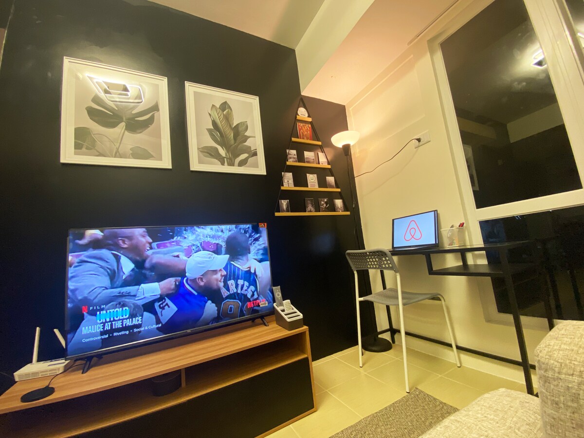 Escapa't a aquesta encantadora unitat d'un dormitori de temàtica suculenta situada a SM Light Residences Tower 1. Gaudeix de la comoditat de l'accés al centre comercial, les persianes opacades per descansar i gaudir d'una vista fascinant dels serveis de la piscina. Tant si estàs treballant com explorant, gaudiràs d'internet d'alta velocitat i telèfon fix, Smart TV (precarregada amb les subscripcions de Netflix i Disney+) i la cuina petita, mentre estaràs a pocs minuts del districte central de negocis. El teu acollidor refugi t'espera!