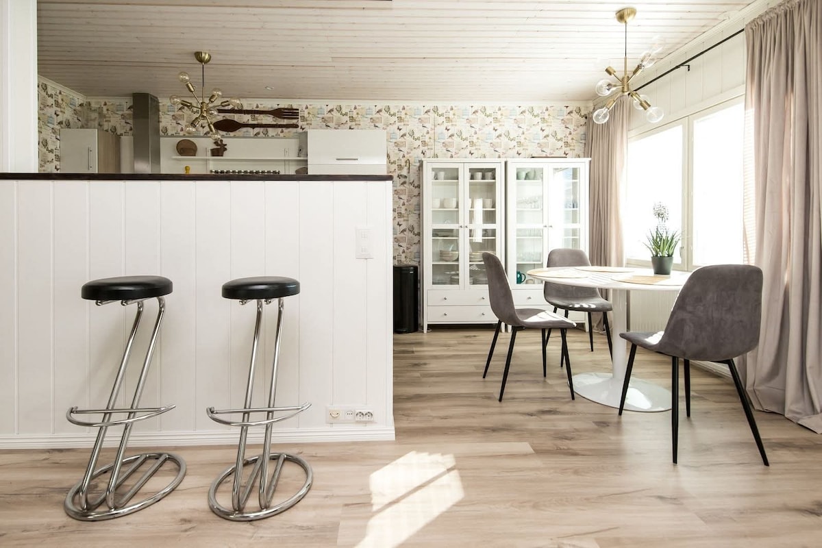 Et dono la benvinguda a Kirkkokatu, una encantadora ciutat insular a Kaskinen, a la costa oest. A la teva disposició hi ha un apartament amb terrassa elegant, de dues plantes, acollidor, totalment moblat i molt ben equipat, àmpliament renovat a la part antiga de Kaskinen. Aquest ampli apartament de 113 m2 té 3 dormitoris separats i 2 banys. El mar, les botigues, la biblioteca i les zones exteriors són a poca distància a peu. Pots aparcar el cotxe al costat de l'apartament de forma gratuïta. Et donem la benvinguda !