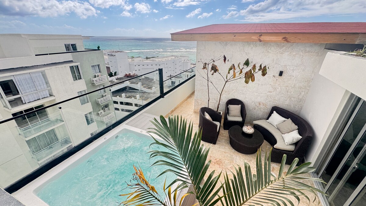 Escapa't al Carib amb estil. Gaudeix d’un pis modern i elegant a només 1 minut a peu de la platja de Boca Chica. Relaxa’t al nostre jacuzzi privat al terrat amb vistes a l’oceà, perfecte per gaudir de postes de sol inoblidables o d’una beguda sota les estrelles. ✔ Habitació gran amb un llit còmode Aire condicionat ✔ potent ✔ Cuina totalment equipada ✔ Bany modern amb aigua calenta ✔ Edifici segur i privat ✔ Ubicació estratègica a prop de restaurants i bars T'esperem...