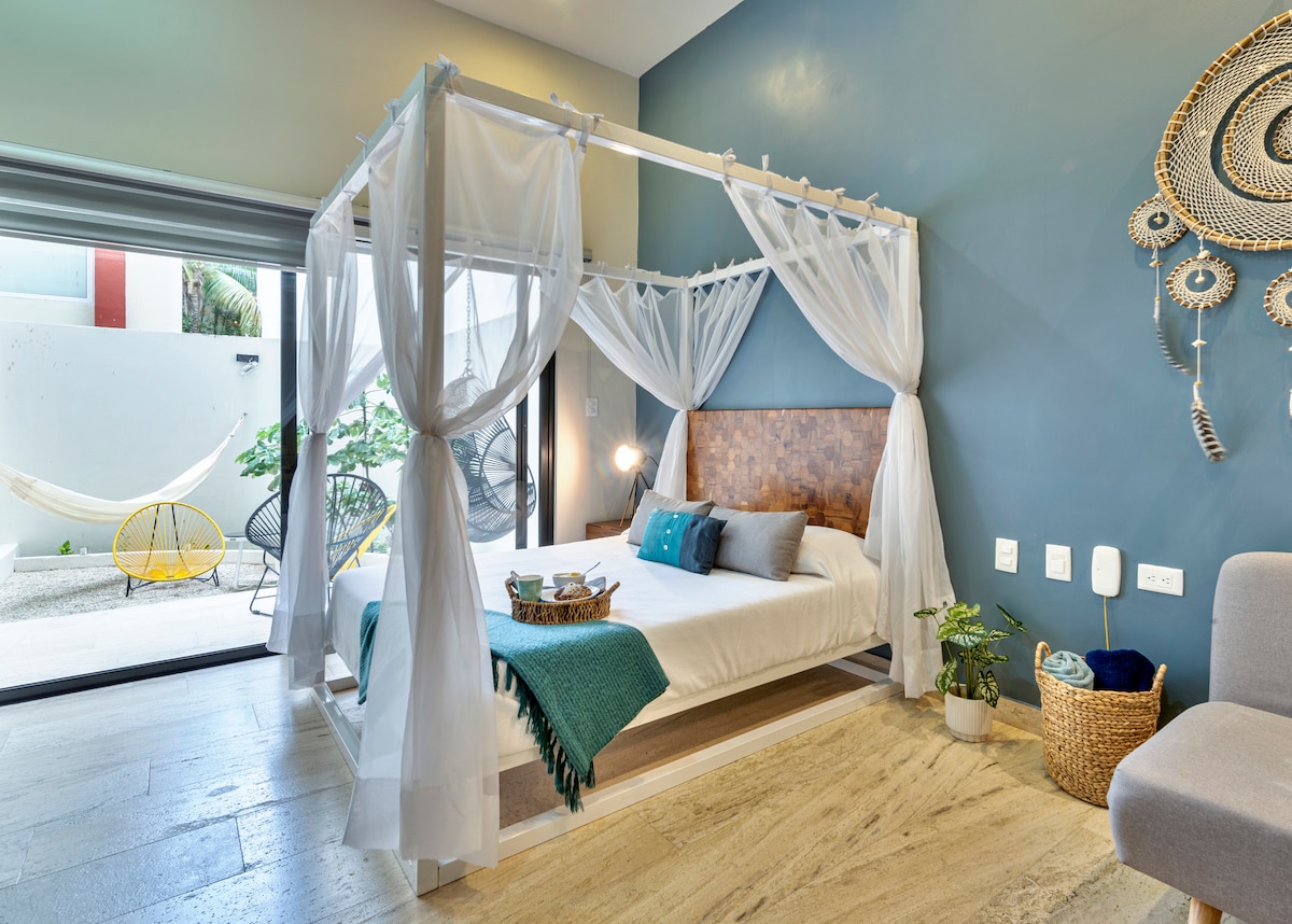 Et donem la benvinguda a KAAB! El nostre modern estudi de luxe es troba on tot està a 5 minuts a peu. A 5 minuts del ferri de Cozumel, a 5 minuts de la terminal d'autobusos ado per accedir a l'aeroport de Cancún, a 5 minuts de la platja o a la famosa cinquena avinguda. La piscina del terrat corre paral·lelament a l'oceà per gaudir d'una vista panoràmica. També hi ha un gimnàs. El nostre estudi té capacitat per a tres persones, cuina completa, wifi de fibra de 100 Mbps, televisor intel·ligent i rentadora. Hi ha seguretat les 24 hores i aparcament públic de pagament a només una illa de distància.