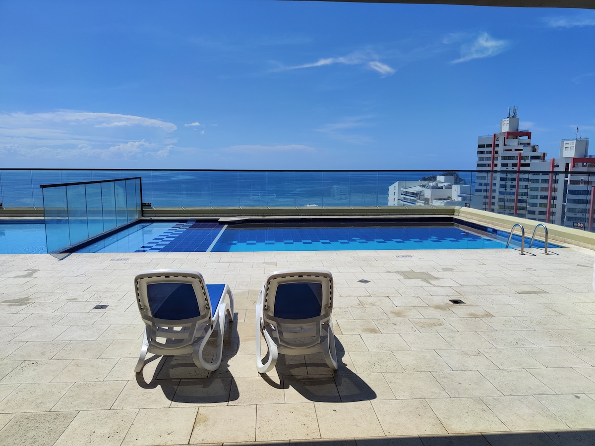 Pis modern d'una habitació totalment equipat al cor de Santa Marta, amb precioses postes de sol a la vora del mar i una gran varietat d'equipaments i serveis, com ara piscina, sauna i gimnàs, per fer que les teves vacances siguin el més còmodes i relaxants possible. A poca distància a peu de la Marina Internacional de Santa Marta i del seu bonic passeig marítim que et portarà al centre històric més antic d'Amèrica continental i on trobaràs molts restaurants i una animada vida nocturna.