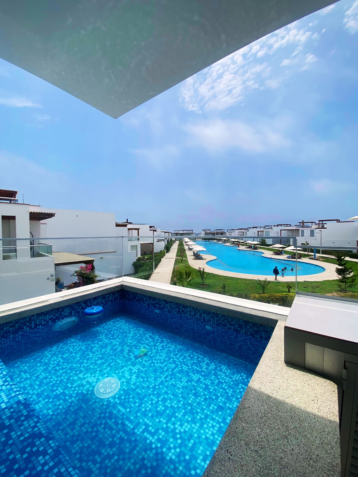 Departamento de 190 metros cuadrados, segundo piso primer piso es el lobby, totalmente equipado y super seguro; El departamento está frente al mar con una bella vista.; también tiene a su disposición: Wifi Jacuzzi con vista al mar Piscina para adultos y niños Cancha de tennis y frontón Zona de golf Cancha de fútbol 5v5 Area de parrilla y fogata Área de juegos para niños Restaurante y bar solo en temporada de verano. Sin sabanas, solo cubrecamas y almohadas.